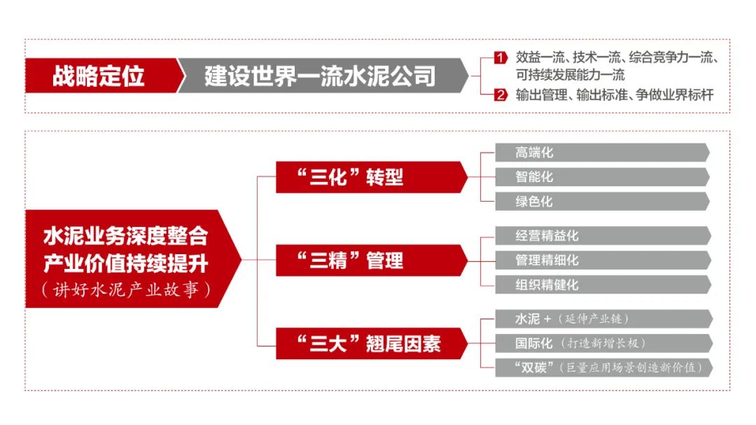 就水泥业务板块深度整合和产业价值提升,他提出三点:一是推动高端化、智能化、绿色化“三化”转型,通过优化升级努力打造环境友好型产业、现代城市标配。中国建材水泥板块在工艺、技术、装备、产品方面具备齐全的生产要素,要进一步发挥好规模、技术、产业链优势,通过整合生产力要素、布局特种水泥产能等实现高端化,通过以智能制造为导向、推进产业数字化等实现智能化,通过推广“双碳”达标、节能减排、协同处置等技术实现绿色化。二是强化经营精益化、管理精细化和组织精健化“三精管理”,通过内外兼修持续提升经营管理水平。内部各区域运营指标比学赶帮努力降本提质增效,外部倡导“行业利益高于企业利益,企业利益蕴于行业利益之中”提升行业价值维护行业生态。三是抓住“水泥+”、国际化、“双碳”三大翘尾因素,通过精心发展新业务不断超越平台期。延伸产业链,通过“水泥+”完成从产品的点思维到产业链的线思维的转变,进一步整合和集中存量资源,打造一批“水泥+”绿色智能制造基地;扩大视野,统筹做好国际化工作,积极围绕健康、绿色、数字、创新等新领域,与行业内和上下游企业携手“出海”,以自主新建和投资并购“两条腿”走路,打造新的增长极;在“双碳”达标的过程中,加大力度做好节电、节煤和原料替代,应用碳捕集利用与封存等技术,用巨量应用场景创造新价值。他希望,新天山水泥要做有使命感的企业、做承接国家战略和社会责任的排头兵,要讲好中国建材水泥业务深度整合、价值持续提升的故事,讲好水泥产业服务人类、服务社会的故事,共同在全球范围内、行业内发声,让更多的人了解、热爱和拥抱环境友好型的水泥企业。