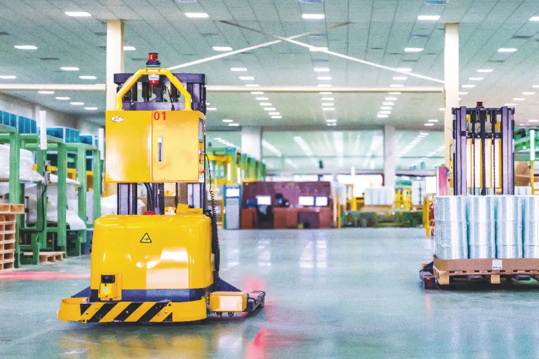 在中国巨石检装车间AGV小车正自动搬运着玻璃纤维产品,发往全球各地