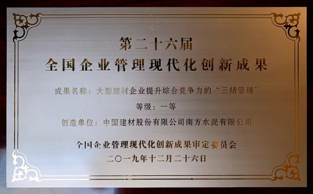 本次获奖的管理创新成果从实施背景、发展历程、指导思想、管理体系、创新要点和实践成效等方面系统阐述南方水泥应对行业产能严重过剩困局和错综复杂经营形势,经过长期的经营管理实践,经中国建材总结提炼形成的三精管理理论体系:“组织精健化”,持续瘦身健体、强基固本,提升组织竞争力;“管理精细化”,持续降低成本、提高质量,提升产品竞争力;“经营精益化”,持续优化经营发展理念、模式、环境,提升可持续盈利能力。