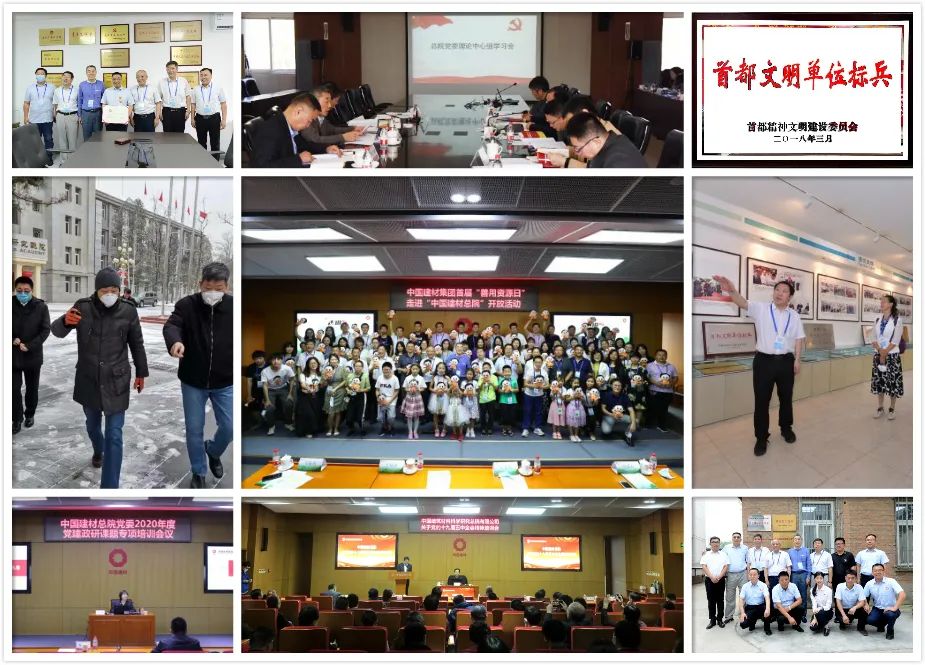 中国建材总院强化党建引领,充分发挥总院科技创新优势、着力为疫区研发快速测温用红外镜头,护目镜防雾喷剂等,并向社区、政府捐赠口罩、消毒液等疫情防控物资,助力疫情防控和复工复产。2020年,中国建材总院开展劳模工作室和专家工作室专项活动,成立以中央企业劳动模范、机械冶金建材行业示范性创新工作室及行业工匠为主体的文寨军工作室和郑京明工作室,并成立了以文寨军和郑京明为核心的特种水泥和光电玻璃研发团队,推动形成尊重劳动、崇尚技能、鼓励创造的良好氛围,引导广大职工在中国建材总院建设中建功立业。中国建材总院积极履行央企责任,努力打造和谐院所,已连续十余年获得“首都文明单位标兵”称号。