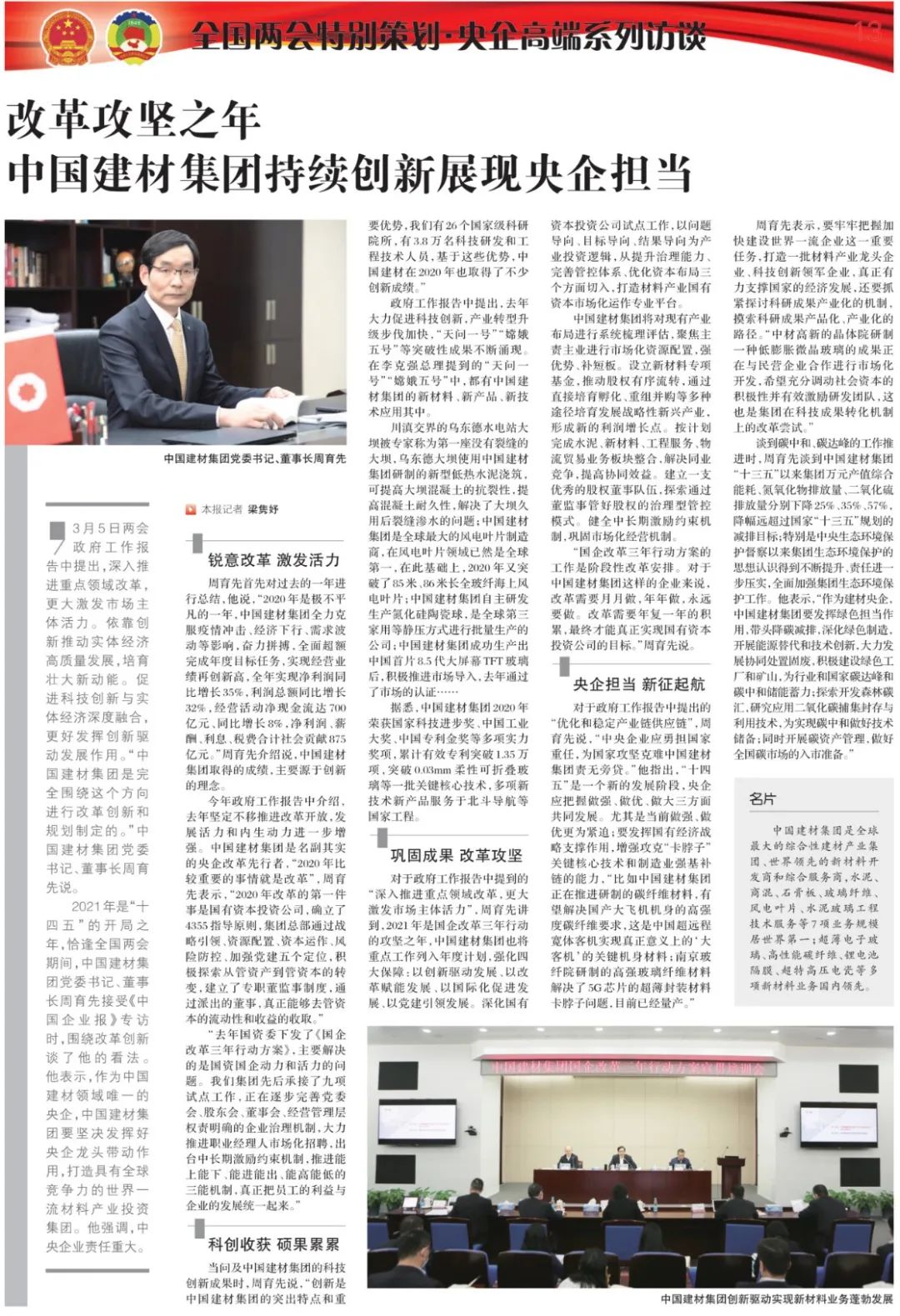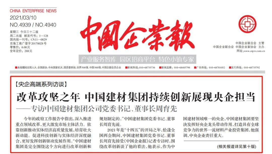 2021年是“十四五”的开局之年,恰逢全国两会期间,搜狗输入法下载 作为中国建材领域唯一的央企,如何发挥好央企龙头带动作用尤为关键。近日围绕改革创新和如何打造具有全球竞争力的世界一流材料产业投资集团等问题,搜狗输入法下载 党委书记、董事长周育先接受了中国企业报记者的专访,相关报道在今天报纸的头版进行了刊发。