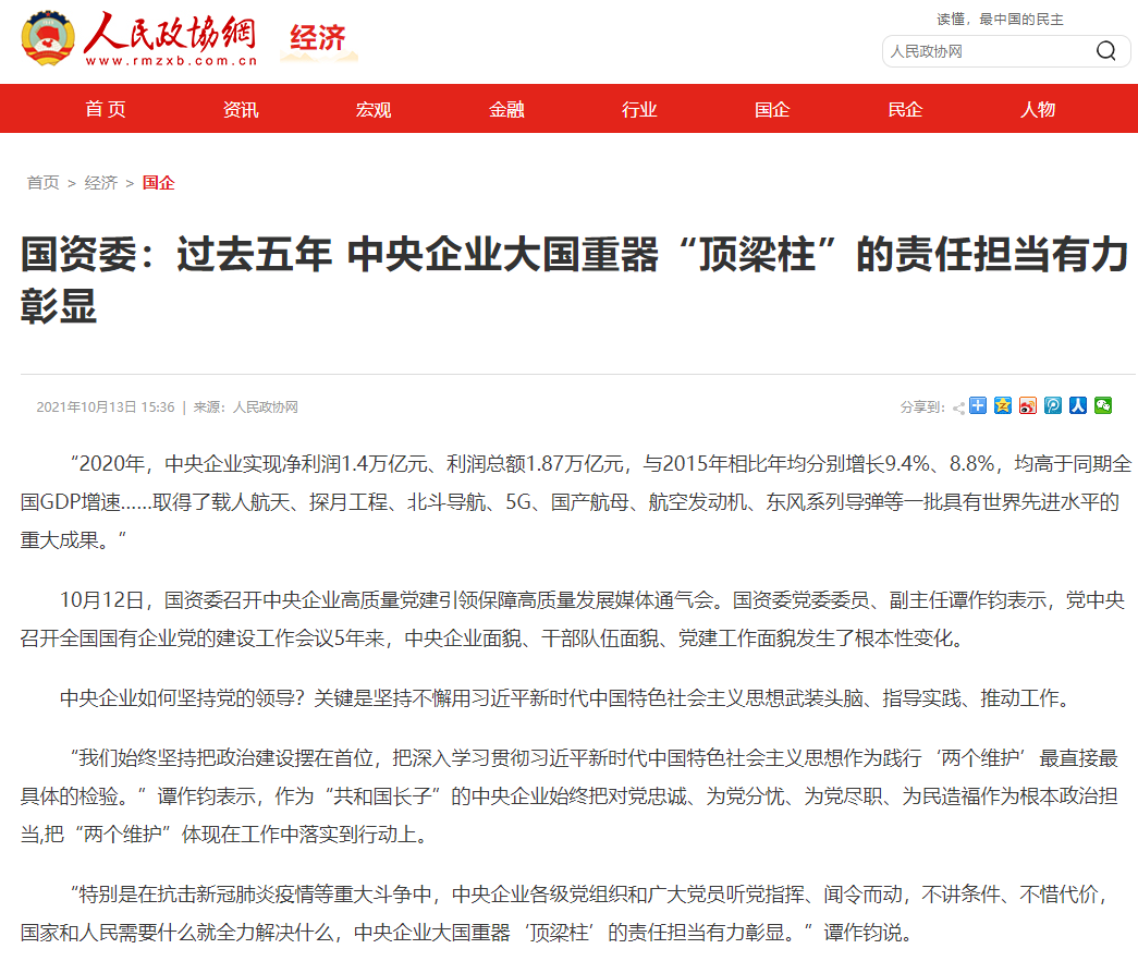 来源:央视新闻、人民日报、国资小新、人民政协网、中国新闻网、腾讯网、今日头条、澎湃 发布时间:2021-10-15
