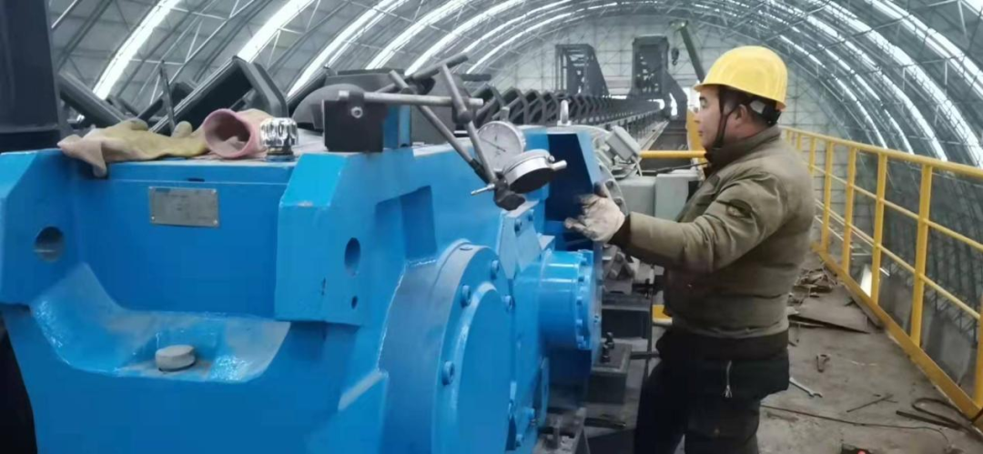 一人一世界,工作人员在为矿石储存输送皮带驱动找正。