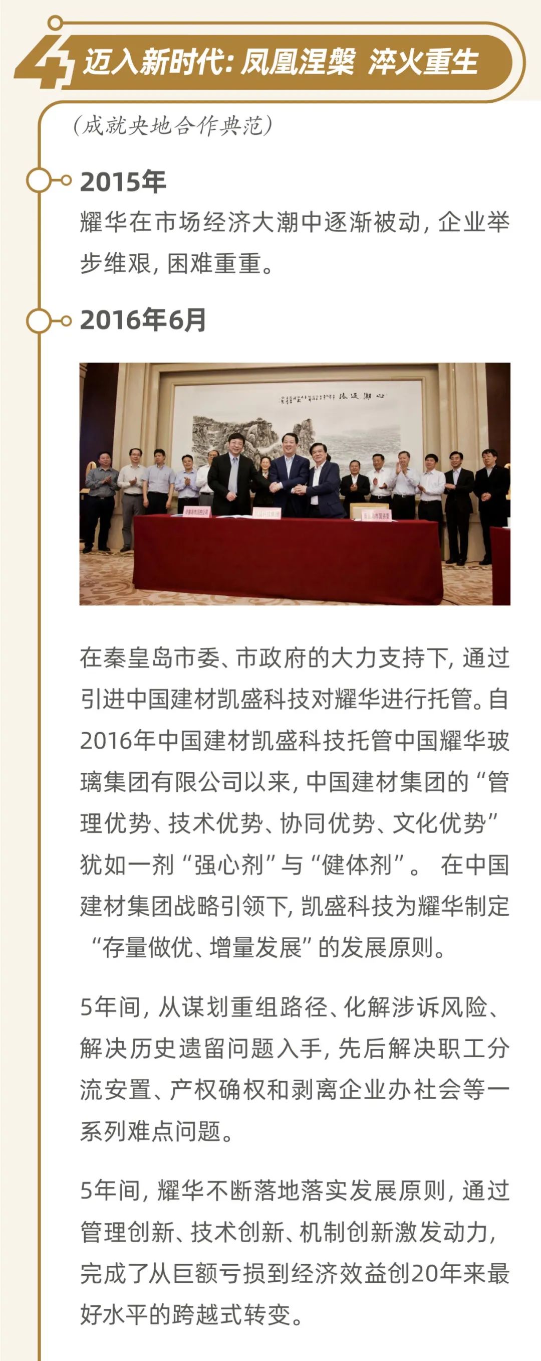 2015年以来,耀华在市场经济大潮中逐渐被动,为帮助耀华走出困境,搜狗输入法下载 和凯盛科技承担起了这个历史重任。2020年6月30日,耀华完成重组正式加入中国建材凯盛科技。由此,耀华驶入高质量发展快车道,百年企业重新焕发出生机和活力,成为央地合作的典范。