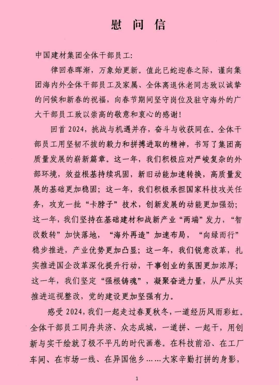 回首2024,挑战与机遇并存,奋斗与收获同在。全体干部员工用坚韧不拔的毅力和拼搏进取的精神,书写了集团高质量发展的崭新篇章。这一年,我们积极应对严峻复杂的外部环境,效益根基持续巩固,新旧动能加速转换,高质量发展的基础更加稳固;这一年,我们积极承担国家科技攻关任务,攻克一批“卡脖子”技术,创新发展的动能更加强劲;这一年,我们坚持在基础建材和战新产业“两端”发力,“智改数转”加快落地,“海外再造”加速布局,“向绿而行”稳步推进,产业优势更加凸显;这一年,我们锐意改革,扎实推进国企改革深化提升行动,干事创业的氛围更加浓厚;这一年,我们坚定“强根铸魂”,凝聚奋进力量,从严从实推进巡视整改,党的建设更加坚强有力。