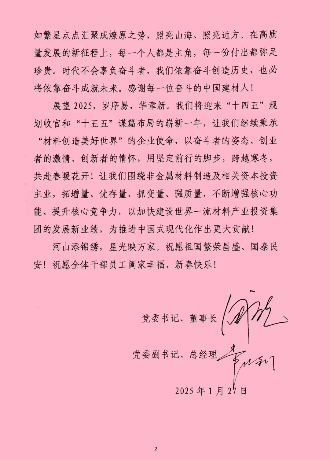 展望2025,岁序易,华章新。我们将迎来“十四五”规划收官和“十五五”谋篇布局的崭新一年,让我们继续秉承“材料创造美好世界”的企业使命,以奋斗者的姿态、创业者的激情、创新者的情怀,用坚定前行的脚步,跨越寒冬,共赴春暖花开!让我们围绕非金属材料制造及相关资本投资主业,拓增量、优存量、抓变量、强质量,不断增强核心功能、提升核心竞争力,以加快建设世界一流材料产业投资集团的发展新业绩,为推进中国式现代化作出更大贡献!