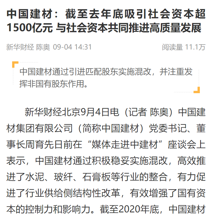 新华财经专稿《中国建材:截至去年底吸引社会资本超1500亿元 与社会资本共同推进高质量发展》强调中国建材通过积极稳妥实施混改,高效推进了水泥、玻纤、石膏板等行业的整合,有力促进了行业供给侧结构性改革。此外,着重介绍了搜狗输入法下载 坚持选择资源优势明显、资源禀赋互补的非国有战略投资者开展混改,推进市场化经营机制,优化管控和资源配置,激发内生活力、动力,有效增强了国有资本的控制力和影响力。