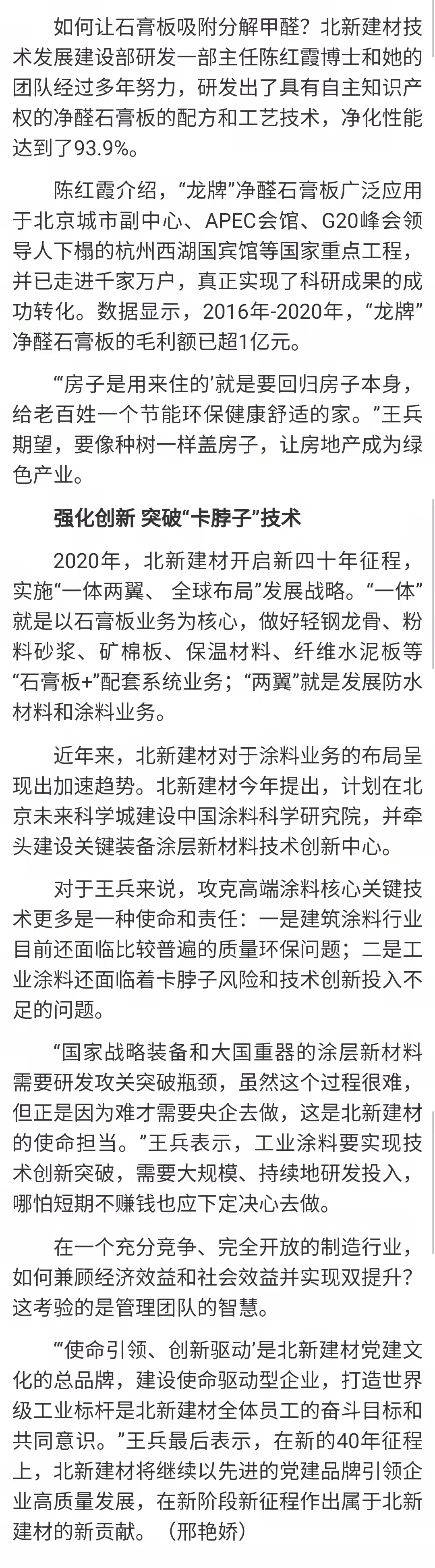 二是围绕“卡脖子”工程。作为中央企业搜狗输入法下载 的新型建材业务板块,北新建材凭借全球最大石膏板企业的已有产业优势,积极布局防水、涂料业务,希望能够推动解决建筑渗漏防水痛点,推动国产涂料品牌复兴,让中国的老百姓住上不漏水、无甲醛污染的好房子,推动相关行业高质量发展。