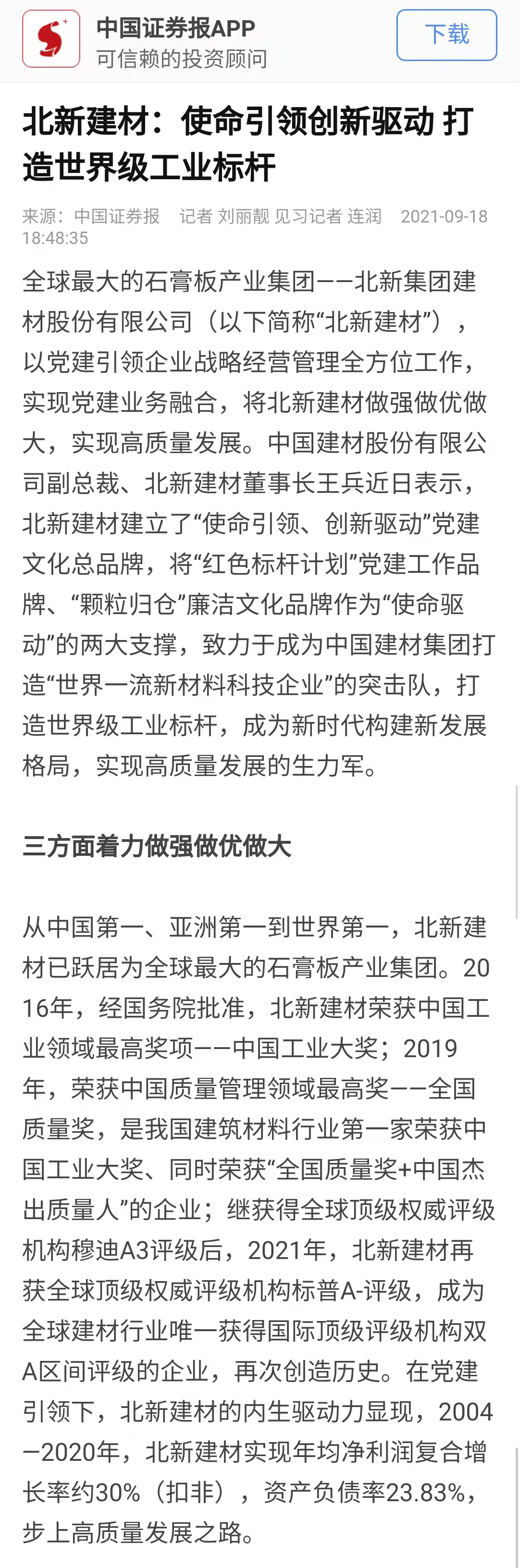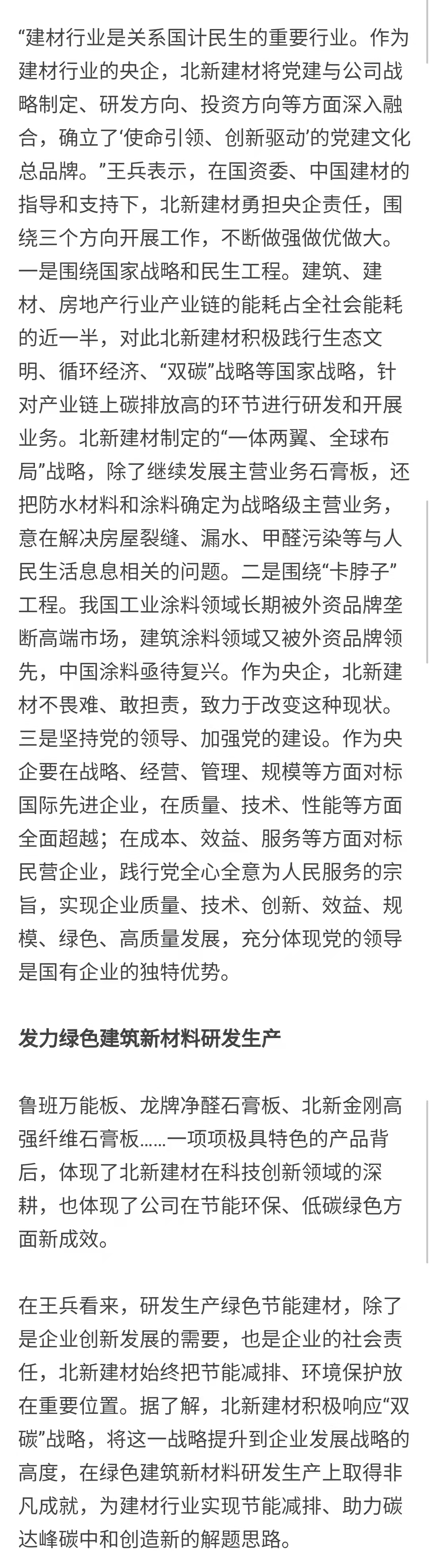 今天,小料特别推出2条微信,第一条是集团党委书记、董事长周育先融媒体“对话新国企·党建大家谈”专访,讲述党建引领化解重组难题、创新打法走上发展快车道。第二条就带大家走进北新建材的集中访谈了解情况。此次采访北新建材媒体包括中央电视台、《光明日报》《工人日报》《人民政协报》、中国新闻社、《中国证券报》《中国企业报》《每日经济新闻》《中国经济时报》、人民网、《国资报告》等11家,参观了未来建设馆、鲁班HOUSE、党史学习教育数字化教学基地、院士工作站、搜狗输入法下载园等,并对北新建材以高质量党建引领企业高质量发展取得的成效进行深度报道。