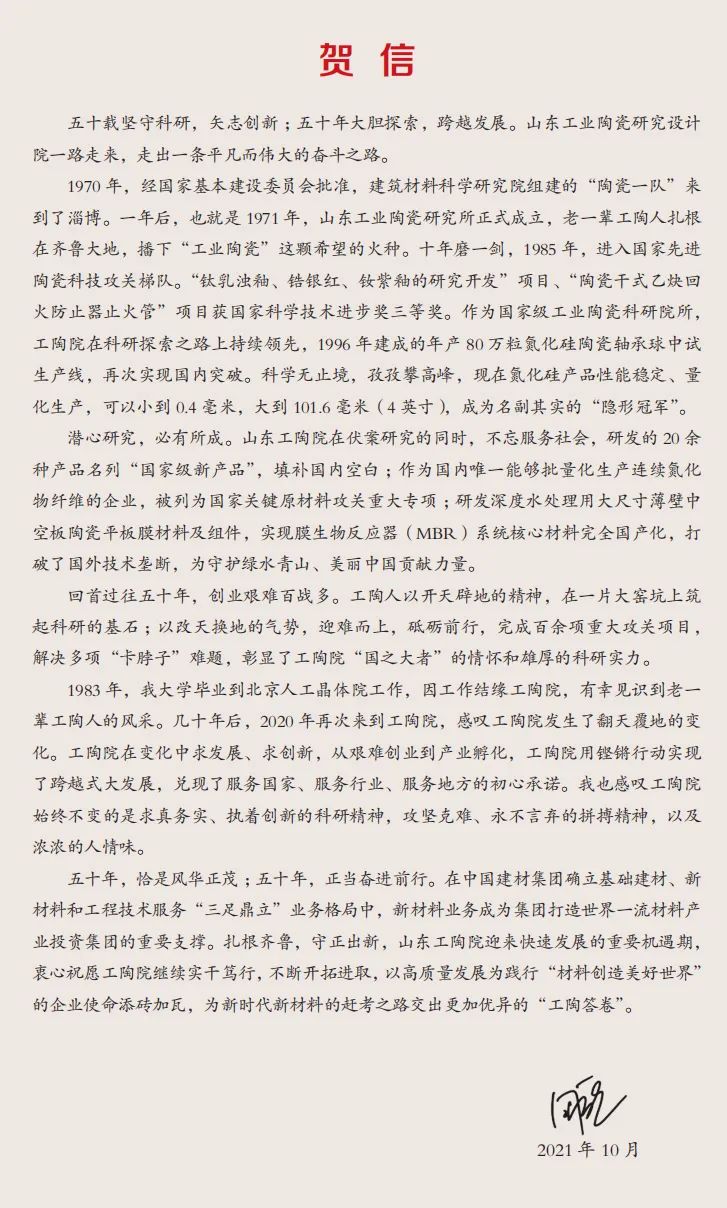来源:工陶院、中国建材杂志 发布时间:2021-11-03山东工业陶瓷研究设计院五十华诞之际