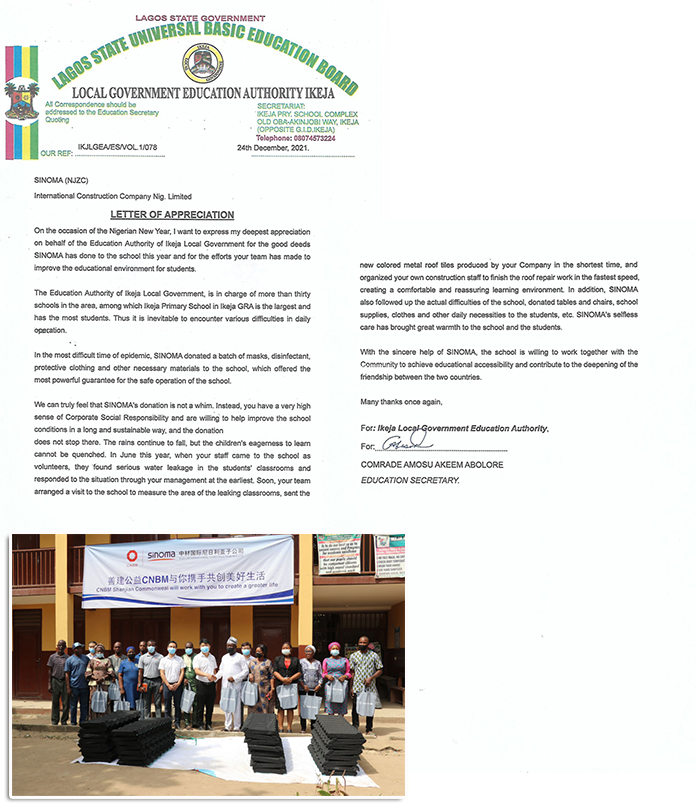 时值2021年圣诞佳节,尼日利亚拉各斯当地政府教育部门向中材国际(南京)尼日利亚子公司致感谢信,对尼日利亚子公司团队热心公益、真诚奉献的行为表示赞扬,对尼日利亚子公司心系教育、勇担社会责任,为改善当地学校办学条件所做的努力表示感谢。