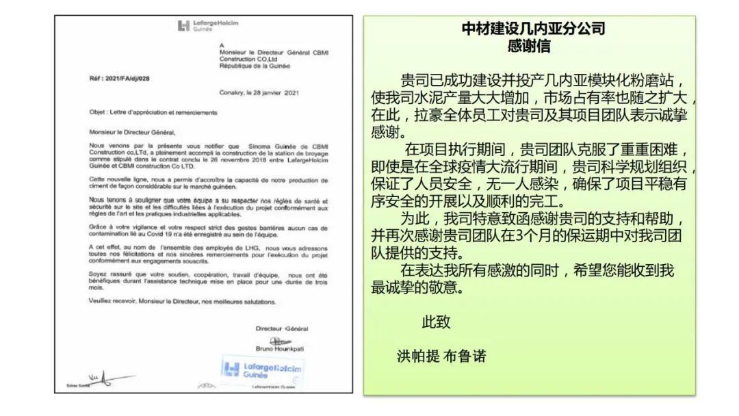 中材国际所属中材建设几内亚模块化粉磨站项目收到Lafarge Holcim业主感谢信