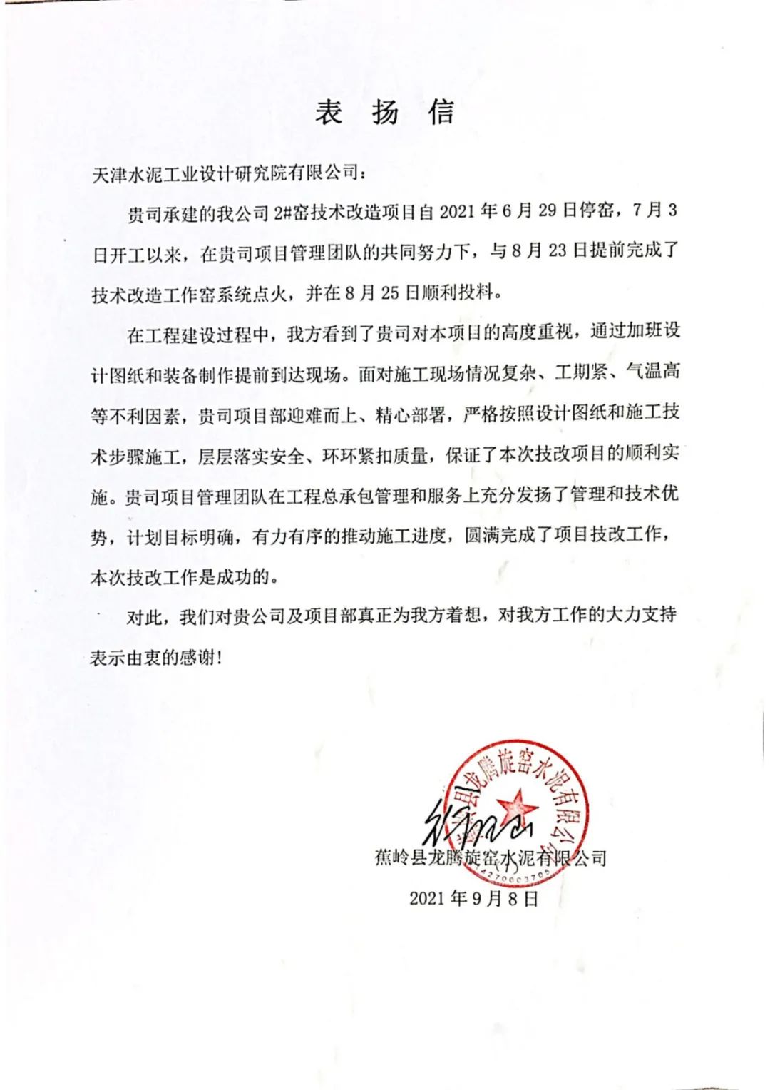 中材国际所属天津水泥院承建项目收到业主感谢信