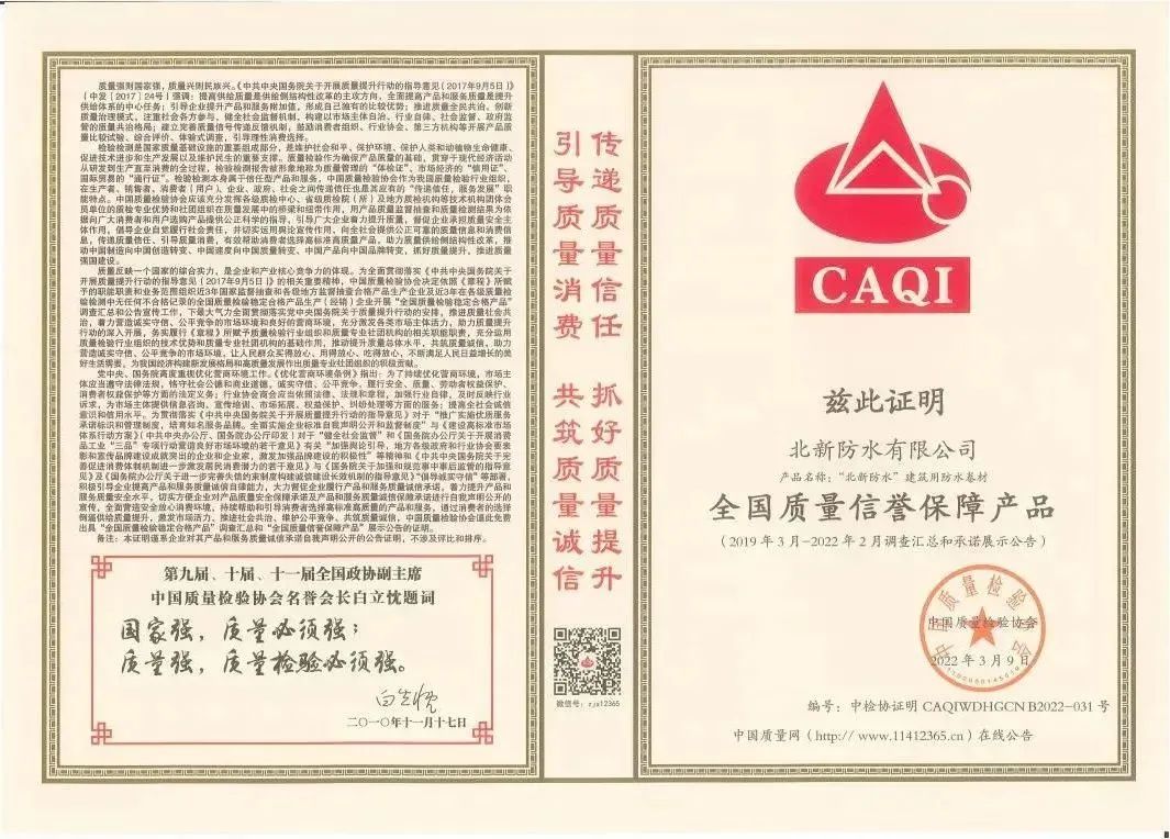 近日,北新防水凭借过硬的产品品质、良好的企业信誉荣获中国质量检验协会(CAQI)颁发的“全国质量信誉保障产品”荣誉,北新防水产品质量再次获得官方权威机构的高度认可。“全国质量信誉保障产品”调查汇总和展示公告工作,旨在以产品质量、国家监督抽查和相关质量检测结果为依据,向消费者选购产品提供公正、科学、权威的指导。中国质量检验协会是全国质量检验机构及质量检验工作者和全国质量监督工作者组织的专业社团组织,在质量监测和检验领域具有非常强的权威性和公信力。