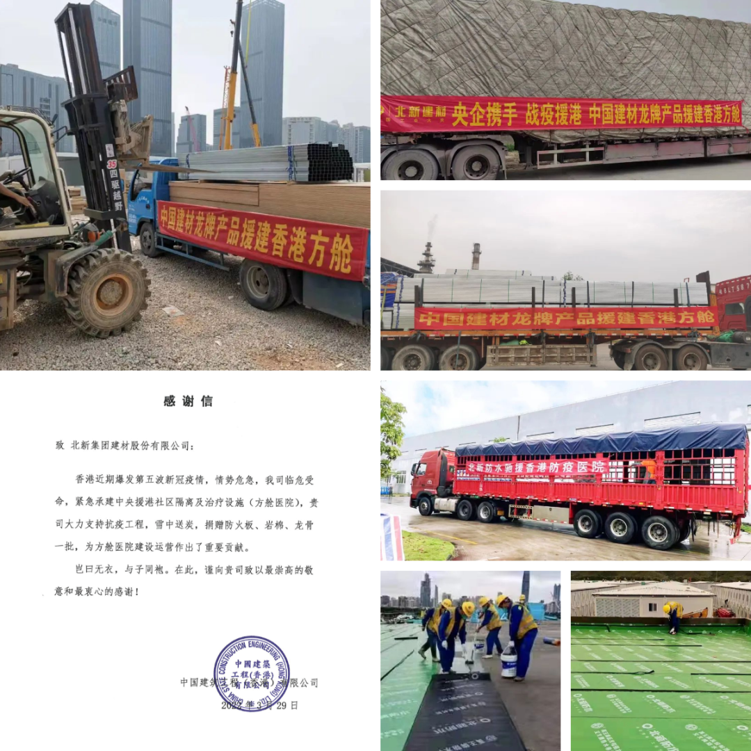 “疫情不灭,北新不退!”北新建材为中央援建香港社区隔离设施项目提供15万平方米耐火石膏板、300余吨轻钢龙骨、450余吨岩棉等龙牌系列产品和解决方案,紧急驰援位于启德、竹篙湾的2个永久性社区隔离治疗设施和青衣、新田、港珠澳大桥香港口岸、粉岭、洪水桥、元朗6个临时性社区隔离设施项目建设,为中央援港社区隔离及治疗设施项目建设提供大力支持。