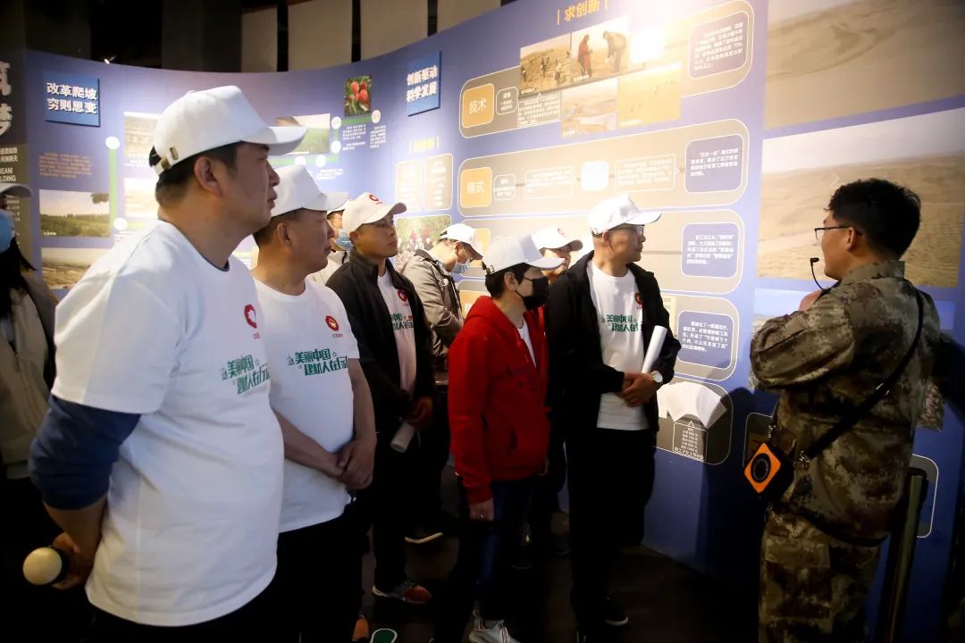 在全国防沙治沙展览馆接受科普教育,大家全方位了解白芨滩防沙治沙取得的成绩和实践经验,深刻体悟“人民楷模”王有德同志的奋斗历程和人进沙退的惊人壮举。