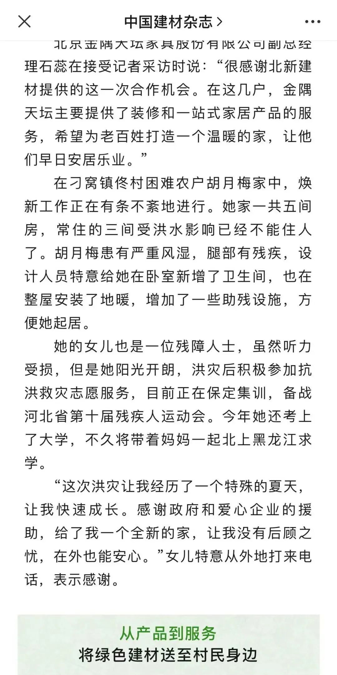 《中国建材》杂志从危房到新居、从产品到服务、从工装到家装三个方面,介绍北新建材积极响应国家号召推进以县城为重要载体的城镇化建设,创新四个转变服务模式,促进家居消费,以绿色科技和高品质建材产品为当地村民生活带来可喜变化。