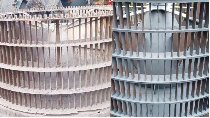 公司对生料1号立式选粉机转子、选粉区域、密封环槽等进行分析,扩大转子直径120mm、增加转子高度140mm,将小导风叶片密封结构改为分段式迷宫密封,突破了设备可靠性、系统电耗的瓶颈,生料系统台时产量由原来的200t/h提高至230t/h,电耗降低0.8kWh/t,年产生效益78.7万元。