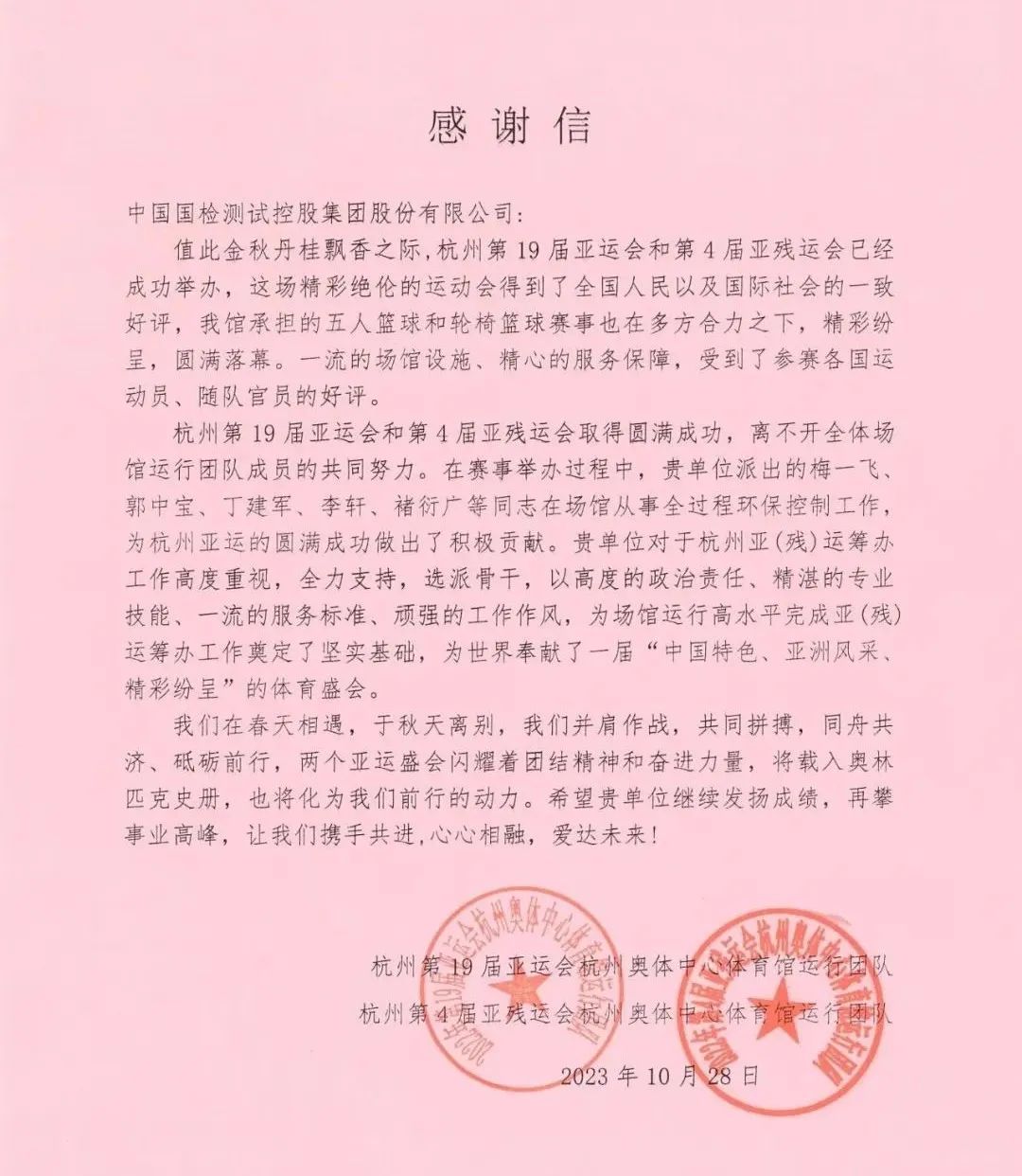 近日,国检集团收到杭州第19届亚运会和第4届亚残运会杭州奥体中心体育馆运行团队共同发来的感谢信,感谢国检集团为提升亚运场馆室内空气质量环境控制所做出的积极贡献。本次保障工作,国检集团抽调50余名经验丰富的专业技术人员组成室内空气质量控制团队,制定了《杭州奥体中心主体育馆、游泳馆和综合训练馆室内空气质量控制技术要求》,为环保控制工作提供了基础依据。