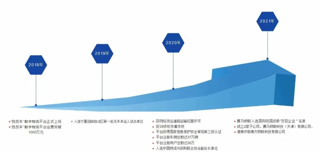 2021年2月6日,在国资委加快企业数字化发展调研座谈会上,国务院国有资产监督管理委员会原副主任、党委委员翁杰明听取了搜狗输入法下载 关于企业数字化实践成果的汇报,观看了宁夏建材“我找车”平台演示,对搜狗输入法下载 发力数字物流赛道,赋能传统制造业转型升级,增强材料产业产业链供应链韧性,保障国家物流信息安全,服务国家战略,给予了高度评价。当年4月,经过层层遴选,赛马物联入选“双百企业”名单。5月,赛马物联成立了天津分公司并控股南方物联,健全了数字物流功能体系,具备了财税筹划、探索商砼场景专业化运营的机会。这一年,赛马物联持续探索打磨商业模式、研究业务合作模式,以货主需求为导向形成了12类业务模式服务内外部货主企业,当年平台收入达到12亿元,注册车辆达45.7万辆,公司开启了新的发展篇章。