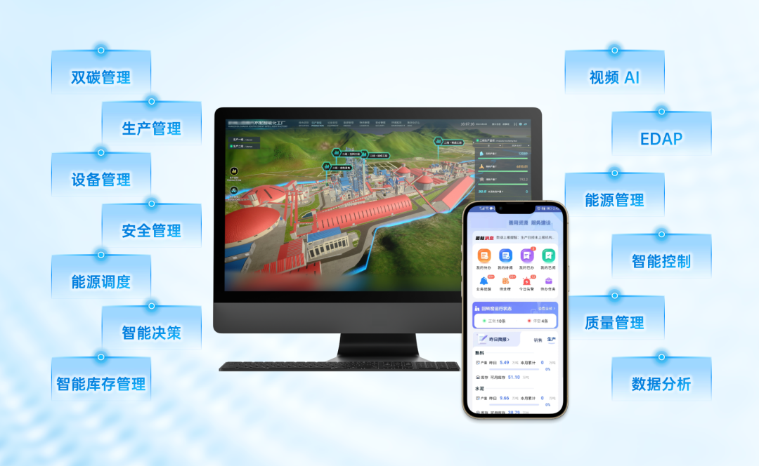 在浙江水泥,生产管理贯穿了区域公司到工厂的生产全过程,上接销售计划,下接DCS控制系统,横向紧密连接物流、质量、设备、能源等各个环节,实现了各业务全流程贯通和数字化协同运转。同时,结合智能调度、智能库存、EDAP等技术支撑手段对生产进行精准管控,促进企业生产精细化、管理透明化,进而达到降本增效的目标。