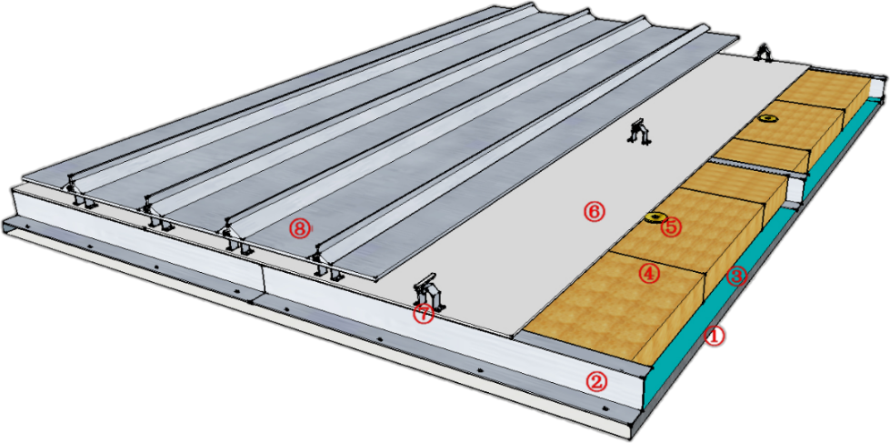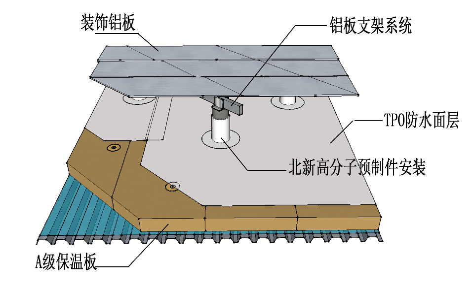 5.无穿孔固定件 6.北新TPO 7.几字支座 8.金属面板