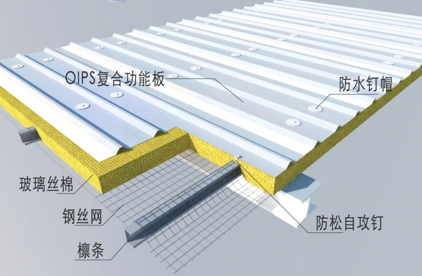 4.节能降耗。OIPS复合功能板浅色表层外观,可有效减少屋面热量的吸收,节能降耗,还具有隔音降噪功能;