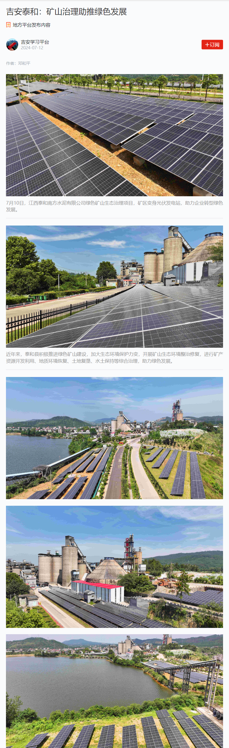 近日,“学习强国”刊发了题为《吉安泰和:矿山治理助推绿色发展》的新闻报道,图文并茂地向读者推介江西泰和南方水泥有限公司绿色矿山生态治理项目助力企业转型绿色发展的成绩和经验,受到了广泛的赞誉和推崇。