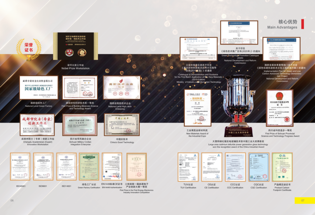 碲化镉发电玻璃荣誉证书