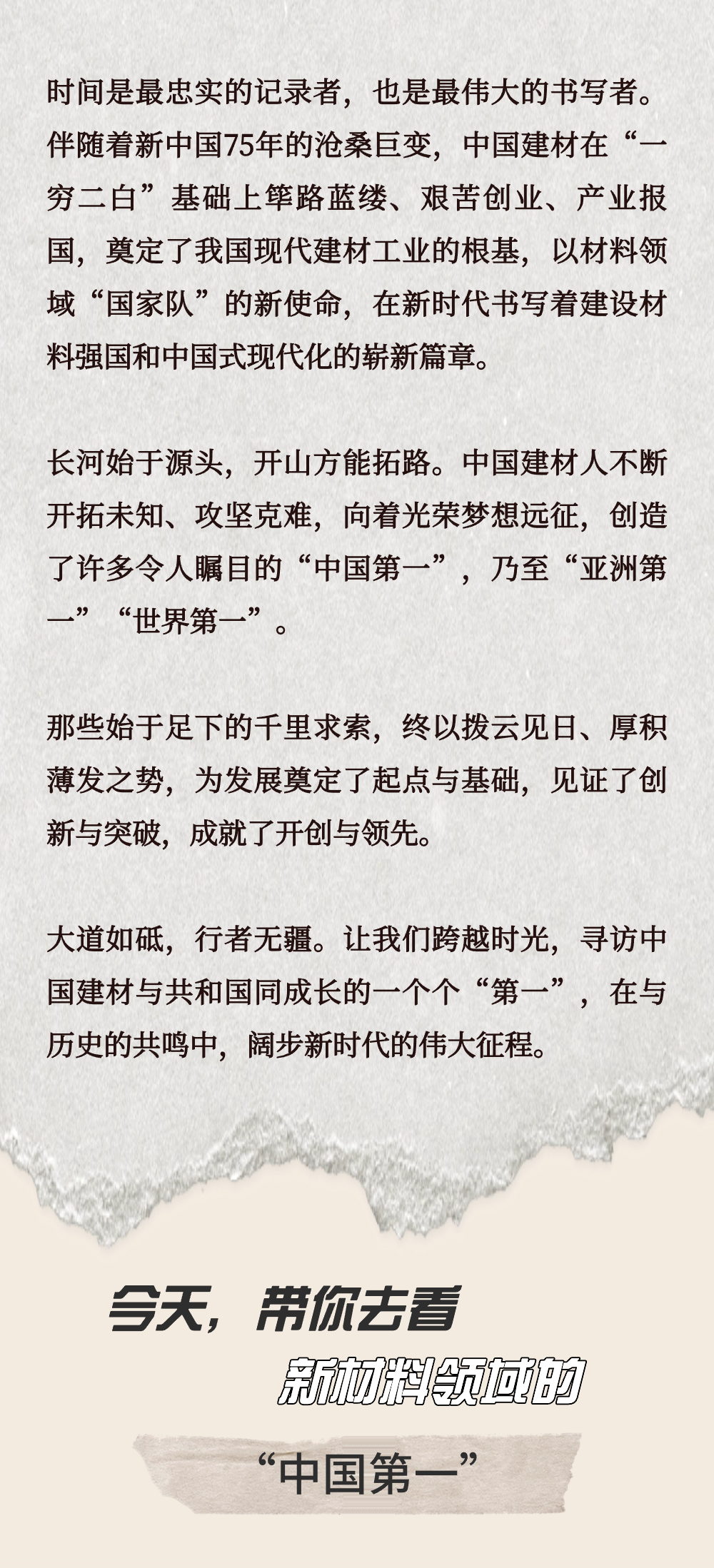 来源:中国建材股份 发布时间:2024-09-27七十五载春秋梦,奋进新程日月长。今年是新中国成立75周年,作为我国建材行业唯一央企,中国建材积极参与国资委《国家工业密码》栏目,与央视联合推出微纪录片《红色丰碑》,组织策划文化心连心巡演、书画作品展等系列活动。我们特开设《致敬75周年》专栏,向大家展示中国建材的新材料、新技术、新成果,展现中国建材人的产业报国、材料强国的家国情怀和使命担当。
