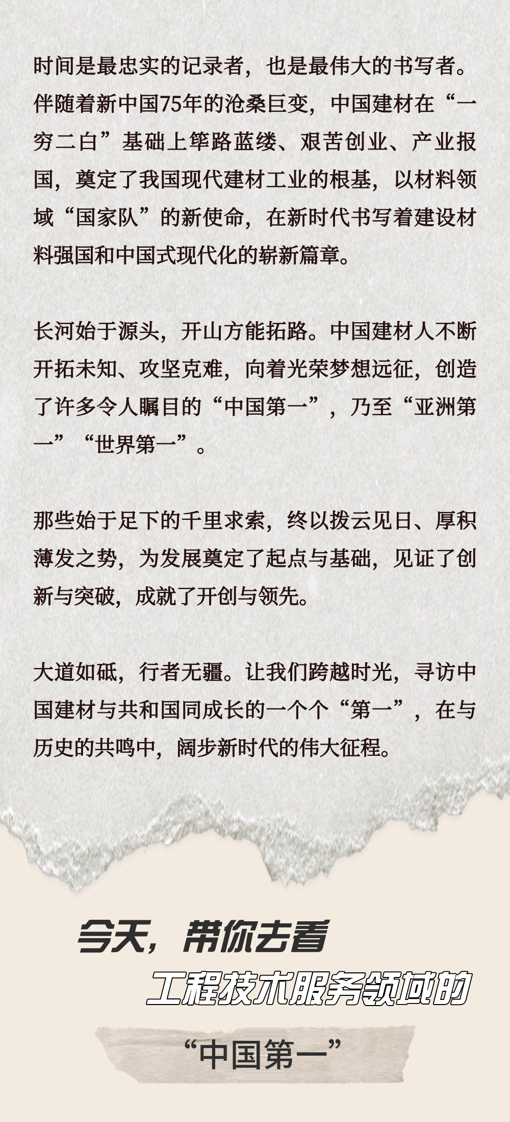 来源:中国建材股份 发布时间:2024-10-22七十五载春秋梦,奋进新程日月长。今年是新中国成立75周年,作为我国建材行业唯一央企,中国建材积极参与国资委《国家工业密码》栏目,与央视联合推出微纪录片《红色丰碑》,组织策划文化心连心巡演、书画作品展等系列活动。我们特开设《致敬75周年》专栏,向大家展示中国建材的新材料、新技术、新成果,展现中国建材人的产业报国、材料强国的家国情怀和使命担当。