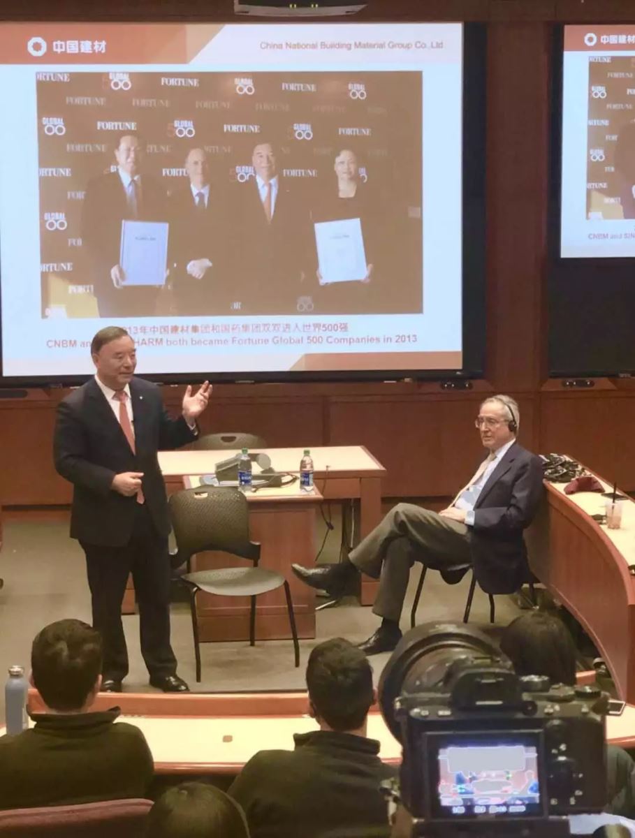 我和鲍沃教授十年前就约定,他希望我来哈佛商学院进行一次案例演讲。大家知道,我是一名央企领导人,如果专门为了来哈佛商学院进行一次案例演讲不太现实,这次是因为去华盛顿在世界银行作为世界水泥协会主席身份做一场关于气候环境的演讲,鲍沃教授就提议我这次应该完成十年前答应的事情,来哈佛商学院给同学们讲讲中国建材成长的故事。我觉得这是非常好的事情,也完成了我多年以前的一个夙愿。我今天来哈佛商学院到得比较早,在整个学院里走了一遭,感觉哈佛商学院实在是太漂亮了,各位同学能在哈佛商学院学习真是人生的一件幸事。同时我也觉得波士顿实在太冷了,没想到会这么冷。但今天在这里,感觉整个屋子还是暖意融融,我想今天给大家讲讲中国建材的故事,也讲讲我本人的经历。