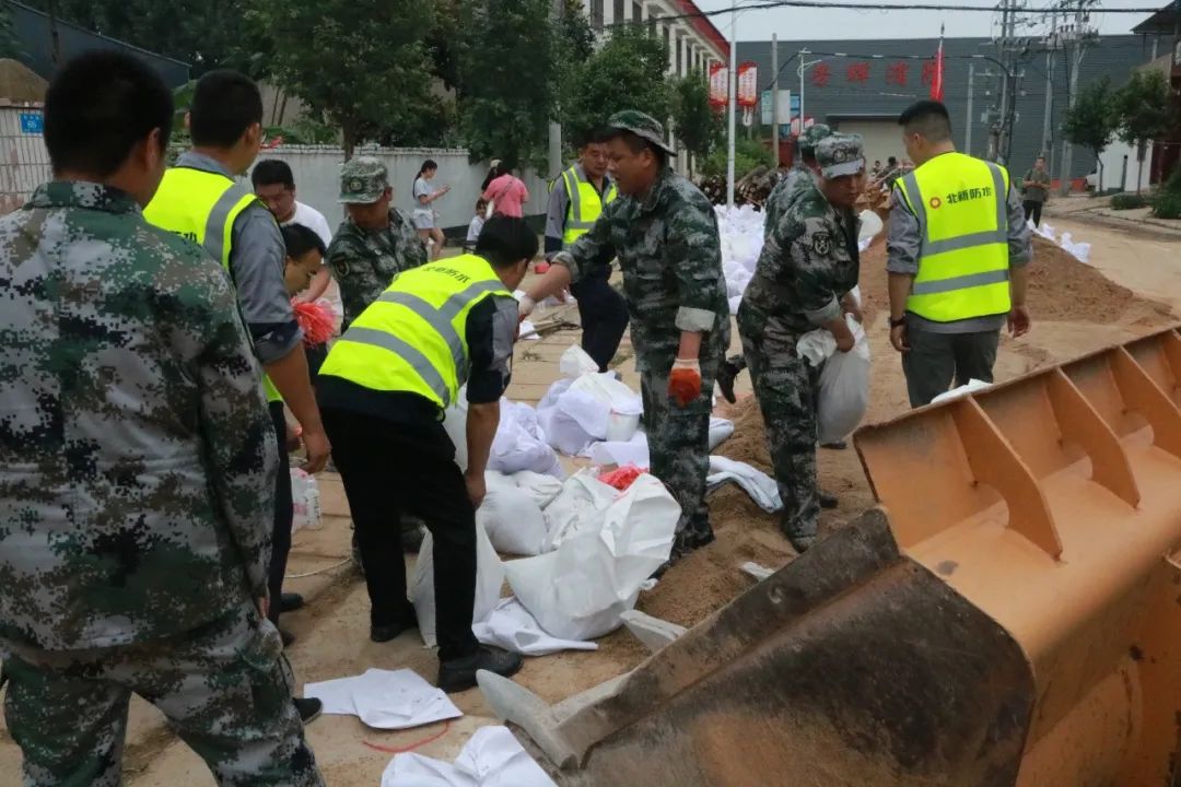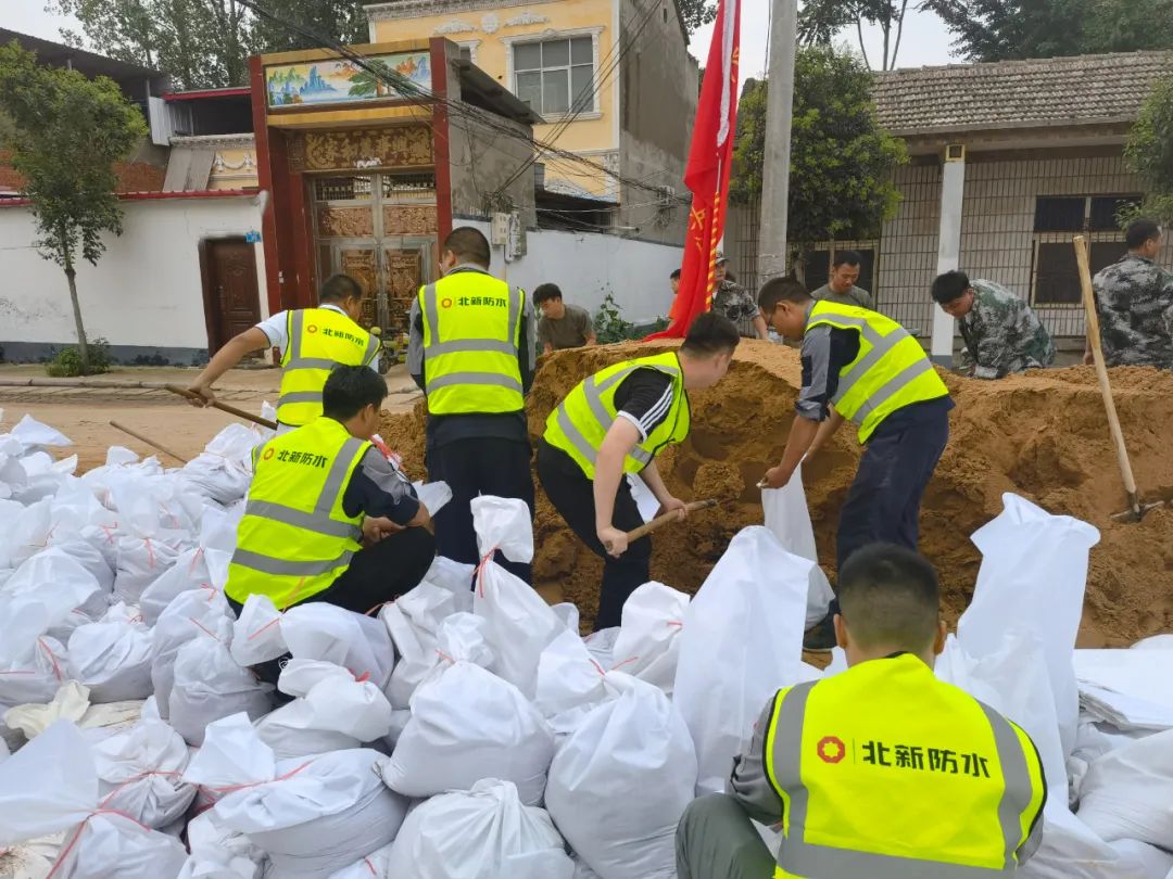 所属北新防水组织成立员工志愿者突击队,在长葛市古桥镇与人民解放军一起堆积沙袋,防止雨水倒灌。
