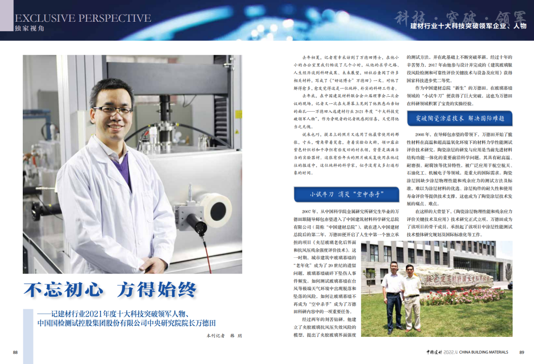 近日,中国建筑材料联合会评选出建材行业2021年度“十大科技突破领军人物”,中国建材总院所属国检集团万德田获此殊荣。为更好地树立科技创新典范,弘扬科技创新精神,《中国建材杂志》社记者走近中国建材总院,多角度报道了万德田背后的生动故事,小料带你去看全文。