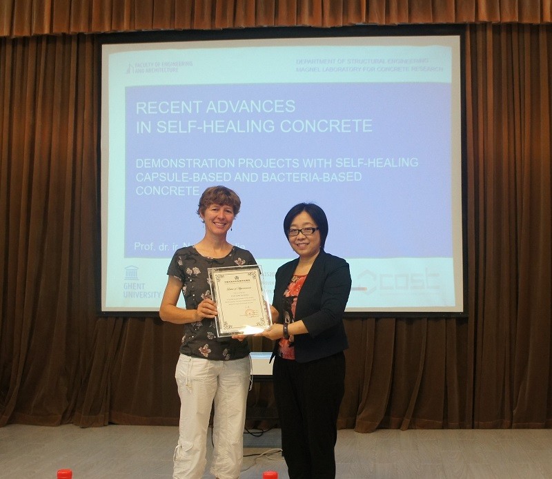 在客座教授聘任仪式上,总院副院长颜碧兰教授为Nele De Belie 教授颁发了聘书。随后,Nele De Belie 教授做了题为“自修复混凝土最新研究进展”的精彩报告,她深入浅出地阐明了胶囊自修复混凝土和细菌自修复混凝土的作用机理,论述了胶囊和细菌对混凝土耐久性的影响,最后她也指出了高掺量的胶囊将有效自修复裂纹,但同时存在成本高的问题,这也是将来需要继续研究的方向之一。