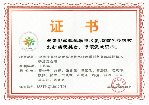 来源: 发布时间:2020-05-225月14日,由北京市科学协会主办,北京科学中心、北京科普发展中心、北京科技人才研究会承办的“发轫众创,双翼承新”首都科技创新成果展发布暨2019年度麒麟科学技术奖颁奖活动,通过北京人民广播电台以“云发布”和“云颁奖”的创新形式播出。总院所属特种玻璃纤维与光电功能材料研究院贾金升教授团队成果《微弱信号探测用高性能光纤传像材料共性关键技术研发及应用》荣获麒麟科学技术奖“首都优秀科技创新奖”。