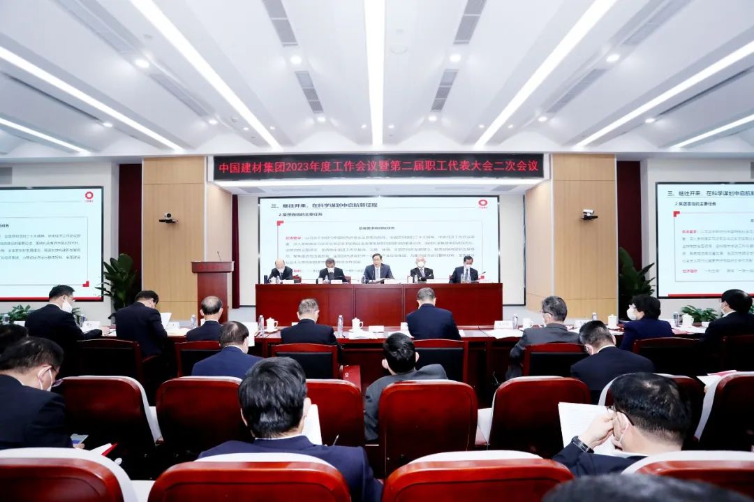 报告全面回顾了集团2022年的工作成绩。面对需求收缩、供给冲击、预期转弱“三重压力”和超预期因素冲击,各级企业和全体干部员工以韧克艰、加压奋进,取得了新成绩,作出了新贡献。一是经营业绩符合预期,基础建材业务稳固了效益根基,新材料业务经营业绩再创新高,工程技术服务业务持续巩固提升。二是狠抓经营管理,稳价格、稳销量、稳现金流、稳供给、降成本“四稳一降”工作成效明显,管理提升、瘦身健体、财务管理、合规管理、安全管理等工作不断推进,发展质量进一步提升。三是强化目标引领和顶层设计,扎实推进基础建材、新材料、工程技术服务、物流贸易等业务整合,玻璃纤维、风电叶片、锂电池隔膜、碳纤维等新材料业务加速布局,数字化转型步伐加快,“双碳”目标加快落实,产业核心竞争力持续提升。四是强化科技自立自强,完成一批科技攻关任务、突破一批关键核心技术,国产大飞机、航空发动机联合攻关成效显著,多项新材料服务保障梦天实验舱、神舟十四、天舟四号等国家重大工程。科研投入和人才引育进一步增强,创新生态全方位优化。五是国企改革三年行动圆满收官,入选国务院国企改革领导小组办公室“学抓促”典型,国有资本投资公司运行机制更加完善,经营活力效率不断增强。六是深入学习宣传贯彻党的二十大精神,干部人才队伍建设高质量推进,全面从严治党向纵深发展,品牌形象进一步提升。