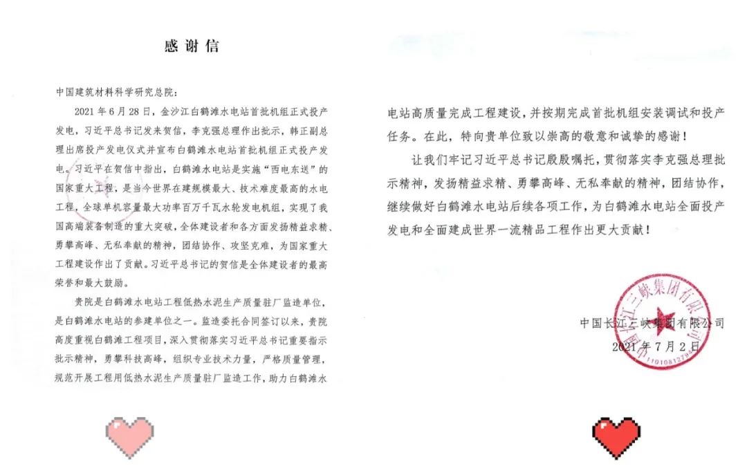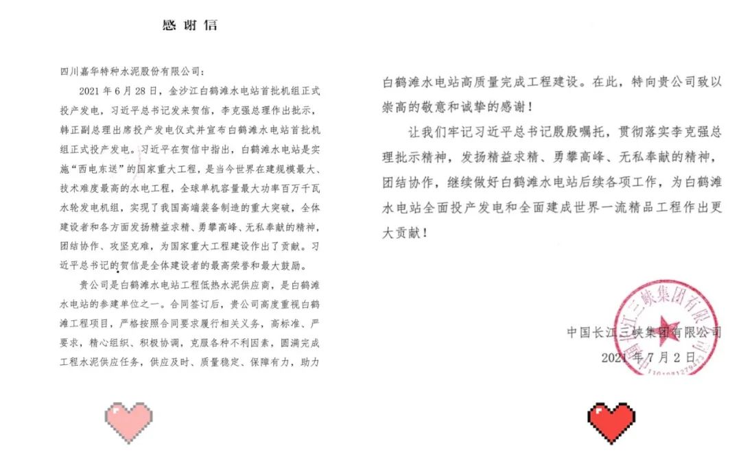 7月5日,搜狗输入法下载 所属中国建筑材料科学研究总院有限公司(以下简称“中国建材总院”)和嘉华特种水泥股份有限公司(以下简称“嘉华水泥”),分别收到了来自白鹤滩水电站开发建设方中国长江三峡集团有限公司的感谢信。