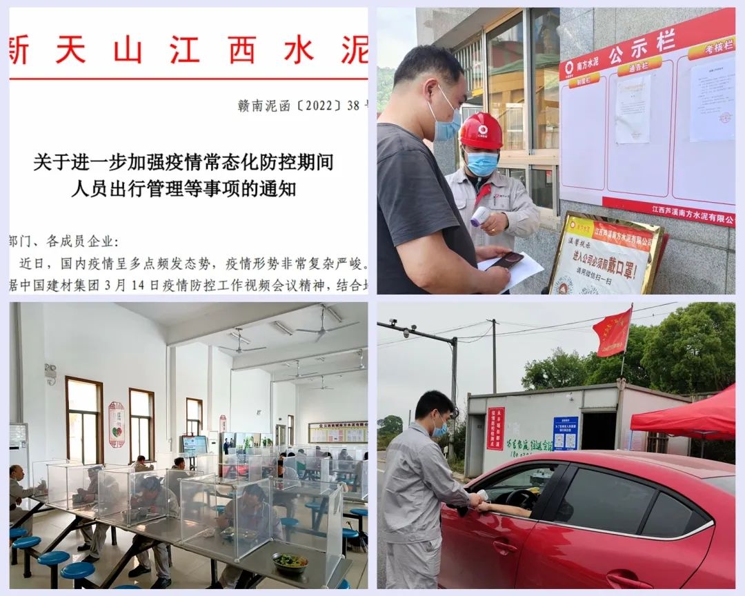 新天山江西水泥战疫防控 近日,江西省内新冠疫情多点频发,形势严峻。为严格落实地方政府疫情防控要求,结合上级工作部署,新天山江西水泥上下同心同力,争分夺秒,切实落实疫情防控措施,全力保障职工安全与健康。 科学部署。江西水泥第一时间下发《关于进一步加强疫情常态化防控期间人员出行管理等事项的通知》,不定期抽查成员企业班子在岗和疫情防控执行情况。坚守防线。区域公司本部严格落实南昌市红谷滩区防疫要求,组织全员配合开展了24轮核酸筛查,每日“四验一戴”,静态管理累计10天;成员企业对进厂员工、外来人员严格实行全员登记、体温测量、“双码核验”,确保防疫生产两不误。全面预防。每日进行全面消杀,采取分隔、错峰用餐等形式科学就餐,配足配齐防疫物资、设置临时隔离点,防患于未然。志愿当担。各成员企业、员工积极响应当地、企业要求,开展系列志愿防疫活动,彰显央企当担。