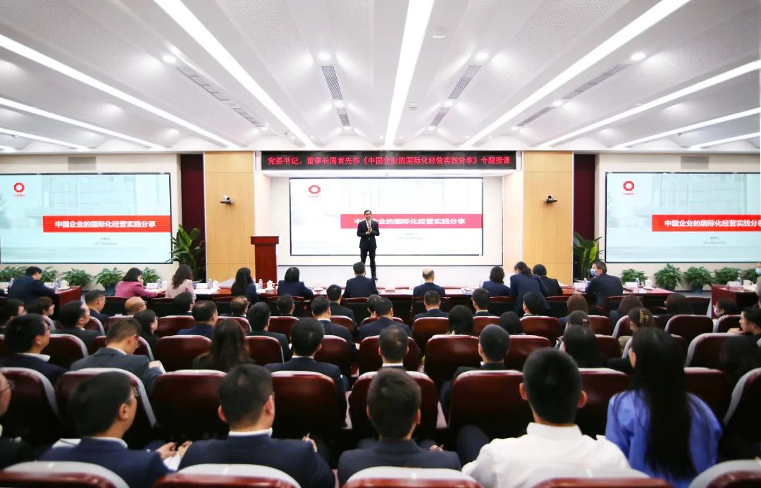 周育先围绕集团国际化战略发展目标,深入分析阐释中国企业“走出去”现状及趋势、国际化战略与路径、境外投资三个专业化工具等内容。他指出,习近平总书记强调坚持高水平对外开放、加快构建新发展格局,当前中国企业面临新的国际形势,国际化是中国企业持续发展的必然要求,也是生存的需要。他分析了集团国际化的战略基础、具备的优势、存在的不足,强调要坚定目标,明确国际化内涵,实现全业务国际化、全流程国际化、全要素国际化。要统筹三个关系,提升五大能力,管控国际化风险。统一国家战略理性与企业经济理性,兼顾经济效益与社会效益、生态效益,统筹发展速度、发展质量和发展安全,提升全面创新、协同发展、风险管控、文化融合和党建引领能力。