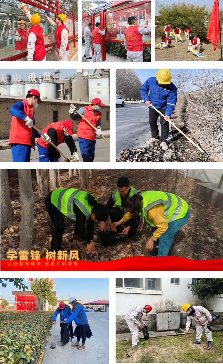 开展弘扬雷锋精神主题党日活动 卧龙中联党委组织开展“学习雷锋精神 争做时代先锋”主题系列活动。党员代表、入党积极分子30余人赴邓州编外雷锋团纪念馆参观学习,聆听了《让雷锋精神世代相传》专题党课。 洛阳中联开展“传承雷锋精神 奉献青年力量”主题团日活动。大家集中学习了党的二十大精神和习近平总书记对深入开展学雷锋活动作出的重要指示精神,观看了微电影《如你》,并进行了厂区清洁工作。 中材湘潭党总支组织开展“传雷锋精神 展职工风貌”主题党日活动。活动以提高员工艰苦朴素作风、增强法治思想、强化节约意识为主题,开展免费法律咨询、缝补衣物、维修办公家具、维修小电器等服务项目,实实在在为职工群众办实事,暖心事。 中复连众组织团员青年到全国学雷锋活动示范点——新浦汽车总站“雷锋车”事迹陈列馆,开展“弘扬雷锋精神 凝聚青春力量”主题团日活动,重温入团誓词,强化责任意识和奉献意识。 争做雷锋好榜样,文明城市共担当 青岛中联混凝土公司组织志愿者到石老人沙滩开展徒步捡垃圾志愿服务活动。 哈密天山水泥党支部组织党员、团员和青年志愿者们在哈密河开展“三月学雷锋 保护母亲河”志愿服务活动。 芦溪南方开展对320国道道路两边绿化及江霞村河道清理活动。 黄河同力组织志愿者深入洛阳市宜阳县锦屏镇,结合市容市貌环境整治工作,助力文明城市创建。 祁连山永登水泥团总支联合中堡镇北坪台社区、祁连山学校开展“学雷锋实践活动”,共同清洁社区环境。 北方水泥联合科苑社区组织开展“传承雷锋精神 争做时代新人”志愿服务活动。 三门峡腾跃同力水泥在渑池县万人广场开展“新时代 新风尚 新生活”文明条例宣传志愿服务活动。 曲阜中联、新安中联、临沂中联、新疆水泥塔什店分公司、伊犁商混公司、巴州销售分公司、北新防水、古丈南方公司组织开展厂区以及周边卫生环境清理活动,并倡导全员积极践行文明健康绿色环保的生活方式,以实际行动推动生态文明建设。 弘扬“敬老、爱老、助老”传统美德 九江南方组织团员青年在马当敬老院开展“敬老爱老”新时代文明实践活动。大家与老人们拉家常,为老人和米粉、摘野草、做米粑,帮老人修剪指甲,并给敬老院进行了“大扫除”,让敬老院焕然一新。 豫南水泥组织志愿者到普会寺镇敬老院开展“学雷锋精神,弘扬社会正能量”志愿服务活动。帮助他们营造干净、舒适的生活环境,为孤寡老人送去真挚的问候以及米面油和牛奶等慰问品。 鲁南中联水泥团委组织公司团员、青年志愿者来到刘岗村探望孤寡老人,送去公司的关怀。随后,对村内新修的公路进行了清扫整理,清除卫生死角,为村民们创造了一个干净明朗的生活环境。 豫龙同力组织志愿者来到确山县盘龙镇官庄社区,为孤寡老人送去生活用品以及牛奶、水果等慰问品,悉心询问他们的饮食起居和身体状况,为他们科普健康知识,并进行了剪发服务、房间整理、院落清扫等活动。此外,志愿者们对官庄社区各个街道进行了环境清理,向社区居民发放《河南省文明行为促进条例》《驻马店市文明行为促进条例》等宣传页并讲解内容,号召大家共同建设美丽文明的家园。 嘉峪关祁连山公司团委组织团员青年前往市福利院开展“学雷锋志愿服务日”活动。为福利院的老人和小朋友们送去水果、零食、纸巾、洗漱用品等爱心物资,并进行了卫生清扫工作。 桂林南方党支部联合属地党总支一起看望慰问企业周边村屯的老党员,为他们送上组织的关怀与温暖。 关爱留守儿童,用爱点亮希望 祁连山水泥的青年志愿者分别到帮扶了12年的吊沟门小学和陇南市特殊教育学校,参观学生的学习环境、了解孩子们的精神状态,赠送文化学习用品,并与孩子们互动交流。 上高南方团支部组织团员青年志愿者走进徐家渡镇东边村小学开展献爱心活动,给乡村留守儿童带去更多的关怀与温。活动现场,孩子们个个洋溢着幸福的笑容,并给志愿者们献舞表示感谢。 植树添新绿,春意更盎然 叶城天山水泥、喀什天山水泥、中材罗定公司组织员工在生产厂区绿化区栽种苗木、树木,对果园内的苹果树进行移植,为创建绿色工厂贡献力量。 中材萍乡水泥党委组织60余名党员、积极分子、团员青年开展“行动践初心,美化果蔬园”志愿活动,对企业果蔬园进行清理和修整。 点点爱心,满满温暖 宁夏建材团委、赛马物联团支部在银横公路洗车行举办了我找车数字物流平台“学雷锋、我行动、善作为”洗车优惠活动,充分发挥赛马物联的平台服务优势,为平台广大车队、司机在复工复产之际送温暖、送服务。 四川雅安西南水泥党支部组织党员到天全县新场镇前阳村开展“精准帮扶暖人心 助农采摘显真情”主题党日活动,帮助当地村民采摘黄果柑1000余斤。 布尔津天山水泥开展“雷锋精神永传承 送群众体检暖人心”学雷锋志愿服务活动,共接送托库木特村民150余人,受到了村民的一致好评。多年来布尔津天山为周边村镇捐赠水泥用于乡村建设、改善人居环境、帮助农牧民修建房屋、维修电路、清理垃圾、接送体检、助农增收等行动,让“天山水泥”成为群众眼中的热心人。 中南水泥所属郴州片区团支部组织金磊南方青年团员志愿者前往公司新项目工地为施工人员发放生活物资,感谢他