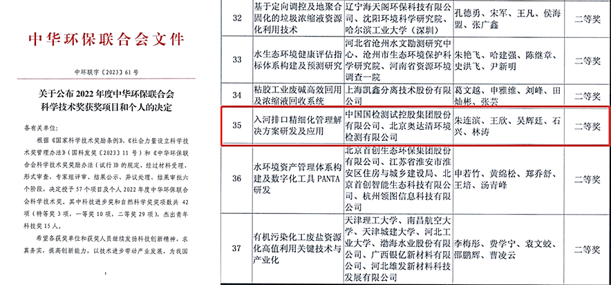 今年4月,由国检集团及所属北京奥达清公司共同完成的《入河排口精细化管理解决方案研发及应用》,荣获2022年度中华环保联合会科学技术奖二等奖,这是国检集团在环保行业第三方综合技术服务领域一次重要突破。