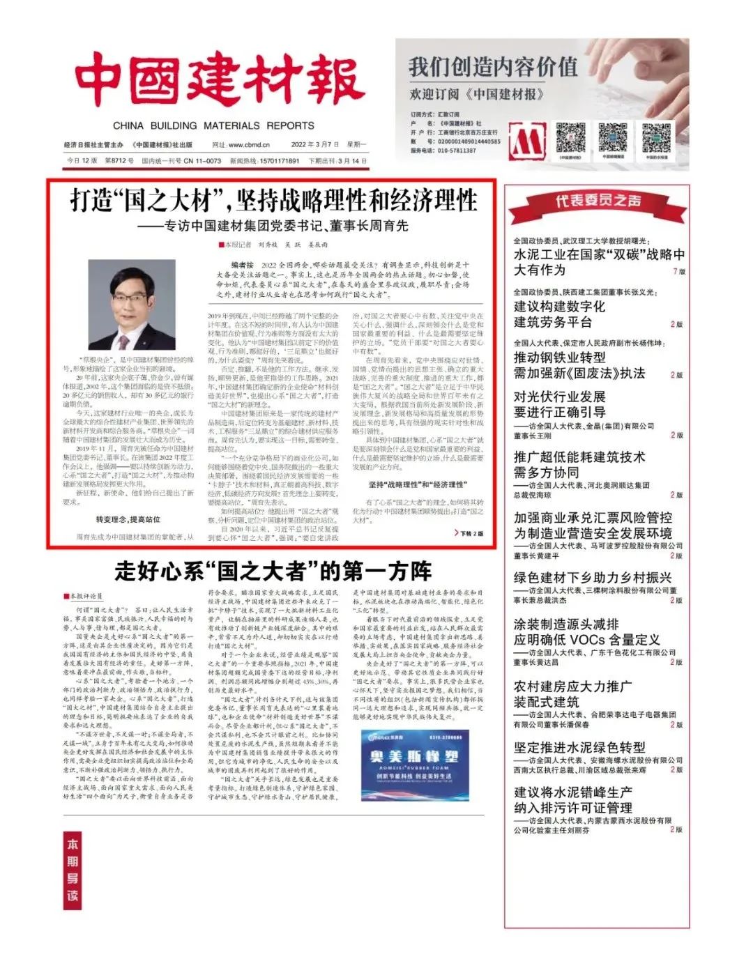 两会专访 | 周育先:打造“国之大材”,坚持战略理性和经济理性