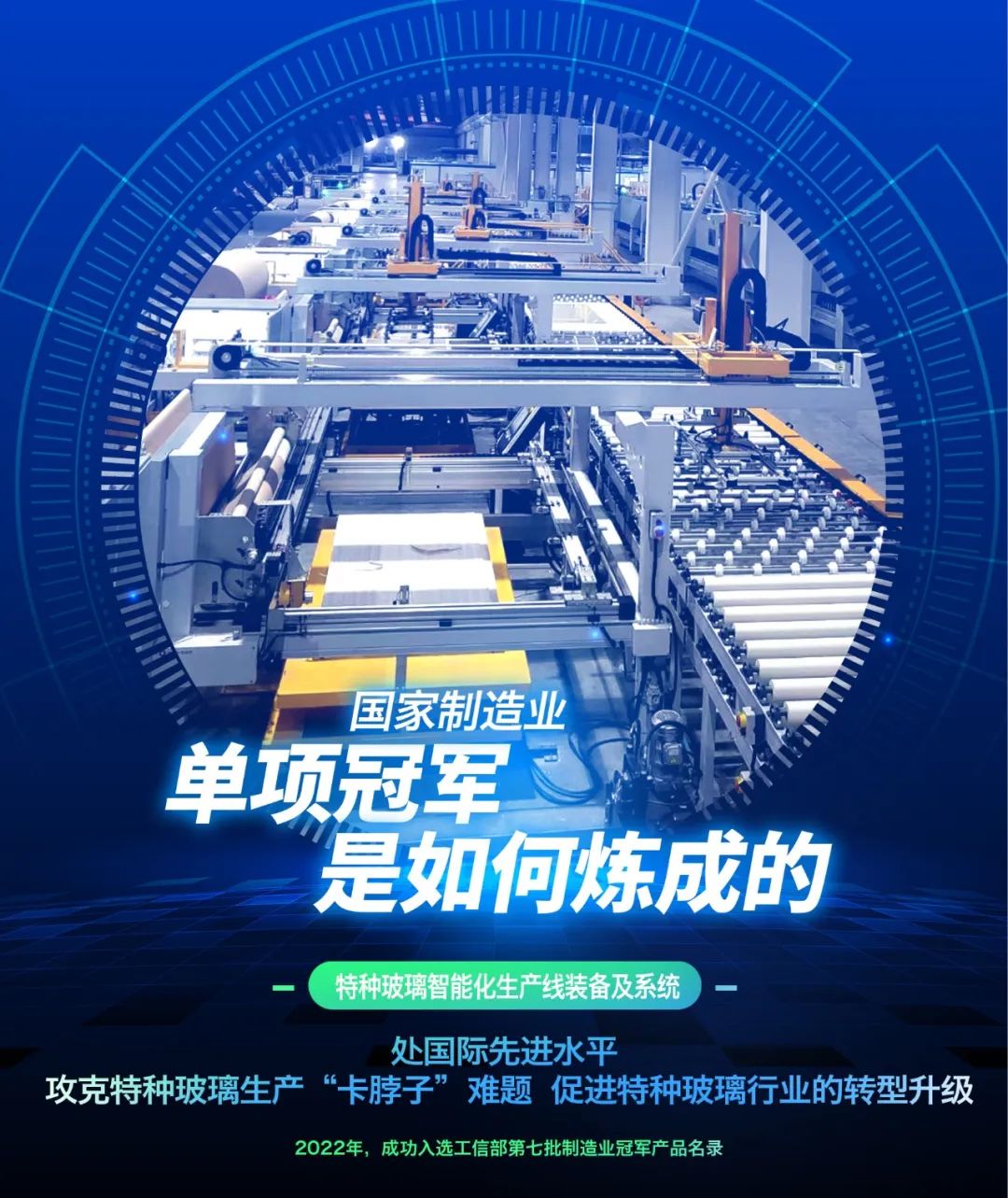 冠军之巅:我们的精彩亮点 促进特种玻璃行业转型升级 特种玻璃智能化生产线装备及系统面向特种玻璃制造,满足了全过程智能定制生产要求,提升了产品制造能力,实现了生产过程的数字化、网络化和智能化。经鉴定,总体技术达到国际先进水平,部分技术处国际领先水平,攻克了特种玻璃生产“卡脖子”难题,起到“补链”“强链”“固链”的作用,促进特种玻璃行业的转型升级。 完善的智能工厂产品体系 智能自动化院立足于数十年非标设备的研究基础,从数智工厂整体规划出发,系统研究了特种玻璃生产工艺流程和生产设备,面向智能装备层(车间)、数智制造层(工厂)、公司应用层(公司)三个层级,打造了完善的智能工厂产品体系,实现了工厂的运营成本、产品研制周期显著降低,生产效率、能源利用率和产品良品率显著提高的目标。 推动数智制造赋能数智未来 智能自动化院通过深度融合新一代信息技术、工业物联网技术、智能机器人技术,建立具有数据实时采集、智能分析、决策支持等功能的信息网络,实现制造信息和管理信息全程透明和共享,实现了从“管工人”到“管数据”的转变,助力企业实现精益生产、绿色制造、大规模柔性制造、供应链协同、产品全生命周期管理的目标。 屡获大奖 智能自动化院成功入选国家专精特新重点“小巨人”企业、浙江省科技“小巨人”企业。相关产品获国家制造业单项冠军产品、“国内首台(套)装备”“省首台(套)装备”“省首版次软件”“浙江制造精品”等荣誉称号。 冠军之道:我们的成功经验 抢抓机遇,坚定业务方向的专业化 智能自动化院聚焦制造强国、质量强国、数字中国的战略谋划,不断提高站位,心怀“国之大者”,坚持“四个面向”,紧跟凯盛科技玻璃新材料“3+1”战略布局,抢抓智能化业务发展机遇,以服务中国智能制造为己任,坚定业务发展的专业化,深耕新玻璃、新材料领域,聚焦科技创新、模式创新和管理创新,注重应用研究和创新平台建设,充分认识产业发展需求,占领技术制高点,提升发展动力,进一步发挥固链补链强链塑链能力,努力成为掌握独门绝技的“单项冠军”“配套专家”,助力企业实现生产制造的数字化、网络化和智能化。 提升技术,创建“智能自动化+”平台 为创建“智能自动化+”平台,智能自动化院确立了“智能制造执行与运营管理系统、智能自动化控制系统、智能装备与生产线、智能检测系统与设备”四个技术研究方向。充分发挥科研创新平台优势和人才优势,通过深度融合智能制造与“互联网+”等物联网技术,取得发明专利和软件著作权达100余项,制修订国家标准、行业标准10余项,构建起了“系统+装备+产线+检测”的智能化、数字化业务知识产权体系,建立了完善的智能工厂产品体系,打造全流程智能工厂整体解决方案提供商,发展涵盖智能工厂全要素的工业4.0示范工程。 拓展市场,加快科技成果产业化 智能自动化院基于产品的精准定位,积极拓展市场,加强集团内外部协同合作,抢抓大客户、大项目、大合同,推动科技成果在光伏玻璃、发电玻璃、显示玻璃、药用玻璃等行业落地实施,发挥了“补短板”“填空白”等重要作用,助力了中国玻璃行业从“跟跑”“并跑”到“领跑”的跨越。产品客户遍布全国20余个省市区,国际市场已在印度、马来西亚等取得突破进展,与多个玻璃新材料大型企业开展深度合作,建立了良好的战略合作关系。产品经客户使用后反映良好,经济和社会效益显著,获得业内好评。 未来我们将深耕智能自动化技术 适应多变的应用场景 加快创建“智能自动化+”平台 在“专精特新”发展道路上 持续助力企业智能制造转型升级 推动数智制造赋能数智未来