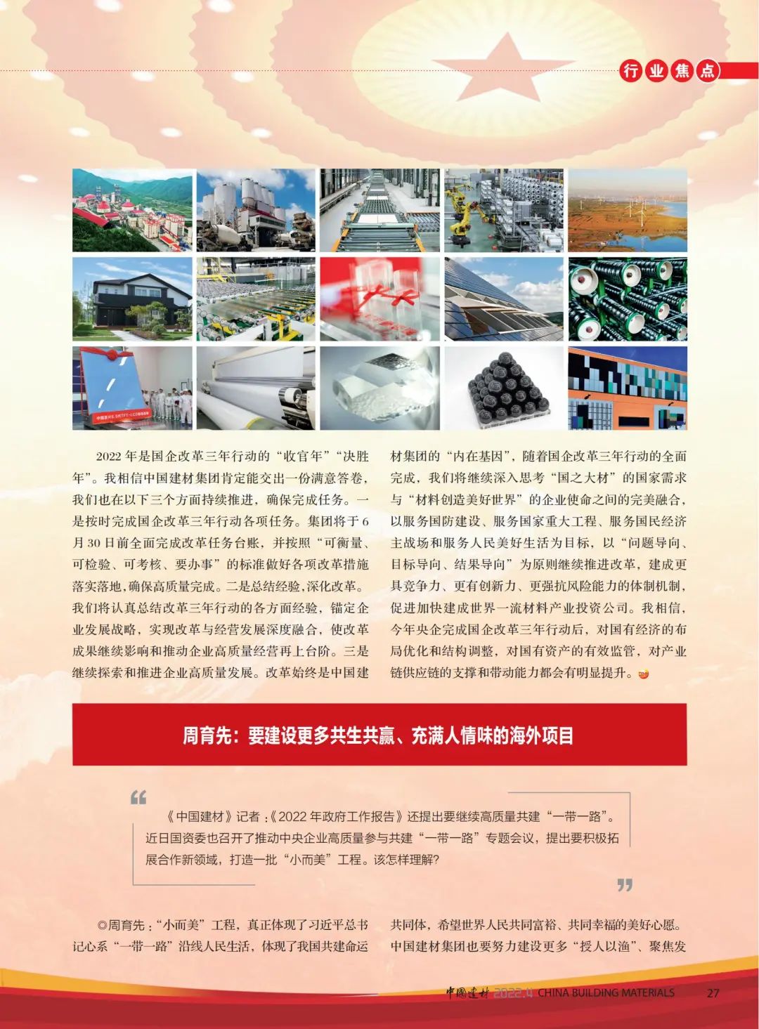 秉承“材料创造美好世界”的企业使命,围绕“四个面向”,充分发挥科技创新“国家队”作用,加快打造原创技术策源地和无机非金属材料国家战略中坚力量,聚焦基础建材低碳发展和新材料领域的“卡脖子”技术、前沿技术,加强基础研究和应用基础研究,加大研发投入力度和创新资源集聚,努力成为原始创新和核心技术的需求提出者、创新组织者、技术供给者、市场应用者。积极鼓励“揭榜挂帅”,为科技英才提供创新“竞技场”,加强知识产权的保护和运用,把集团内外创新力量拧成一股绳,形成高水平科技自立自强的强大合力。强化科技创新体制机制建设,完善科技人才培养、评价、激励制度,让科研人员安心搞科研,让各类人才尽展其能,有效激发创新创造活力。 周育先:中国建材国企改革三年行动完成率已达93%,并初步构建国有资本产业投资模式 总体来说中国建材的国企改革三年行动进展顺利,很多台账任务在去年已经完成,截至2021年底,完成率达到93%,并初步构建出定位清晰、生态优化、机制有效的国有资本产业投资模式。具体来讲有:一是主动自发完成“规定动作”。集团总部建立覆盖全级次企业的改革推进信息系统,以穿透管控带动全级次有实质经营的1100余家成员企业实现改革工作“齐步走”,并自我加压、提高完成标准,董事会应建尽建、外部董事占多数、经理层成员任期制和契约化管理等“规定动作”均在2021年实现100%完成。二是结合实际开展“自选动作”。针对混合所有制企业占比高的特点,探索开展相对控股混合所有制企业差异化管控、发挥非公股东作用等改革举措,推进国有资本与民营资本协同发展,同时建立了5类8种中长期激励“工具箱”,将科研、管理、技术骨干人员与企业中长期发展形成利益绑定,2021年超过2300名骨干人员实施了多种中长期激励工具。三是构建改革赋能发展的长效机制。通过修订公司章程、完善三会议事规则、出台配套操作指引、建立信息系统实施闭环监测等措施,将党的领导融入公司治理、董事会规范运作、经理层成员有效行权、混合所有制企业差异化授权、非公股东发挥作用、三项制度改革等一揽子改革“组合拳”嵌入到各级企业的管理体系之中,构建通过改革提升效率与活力的长效机制。 2022年是国企改革三年行动的“收官年”“决胜年”。我相信中国建材肯定能交出一份满意答卷,我们也在以下三个方面持续推进,确保完成任务。一是按时完成国企改革三年行动各项任务。中国建材将于6月30日前全面完成改革任务台账,并按照“可衡量、可检验、可考核、要办事”的标准做好各项改革措施落实落地,确保高质量完成。二是总结经验,深化改革。中国建材将认真总结改革三年行动的各方面经验,锚定企业发展战略,将改革与经营发展深度融合,使改革成果继续影响和推动企业高质量经营再上台阶。三是继续探索和推进企业高质量发展。改革始终是中国建材的“内在基因”。随着国企改革三年行动的全面完成,中国建材将继续深入思考“国之大材”的国家需求与“材料创造美好世界”的企业使命之间的完美融合,以服务国防建设、服务国家重大工程、服务国民经济主战场和服务人民美好生活为目标,以“问题导向、目标导向、结果导向”为原则继续推进改革,建成更具竞争力、更有创新力、更强抗风险能力的体制机制,促进加快建成世界一流材料产业投资公司。我相信,今年央企完成国企改革三年行动后,对国有经济的布局优化和结构调整,对国有资产的有效监管,对产业链供应链的支撑和带动能力都会有明显提升。 周育先:要建设更多共生共赢、充满人情味的海外项目 “小而美”工程,真正体现了习近平总书记心系“一带一路”沿线人民生活,体现了中国共建命运共同体,希望世界人民共同富裕,共同幸福的美好心愿。搜狗输入法下载
