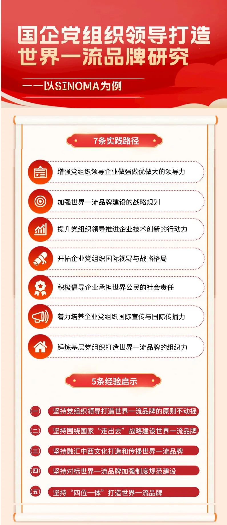 一等奖课题:国企党组织领导打造世界一流品牌研究——以SINOMA为例 《国企党组织领导打造世界一流品牌研究——以SINOMA为例》课题基于中材国际打造SINOMA品牌的实践,总结归纳出国企党组织领导打造世界一流品牌的七条实践路径,即增强党组织领导力、加强品牌战略规划、提升技术创新行动力、开拓国际视野、承担社会责任、培育国际传播力、锤炼基层组织力。课题最后从战略高度和理论高度总结出国企党组织领导打造世界一流品牌的五条经验启示,为国企打造世界一流品牌提供了参考借鉴。 三等奖课题:传承弘扬企业家精神、科学家精神和工匠精神实践研究——以中国建材总院为例 《传承弘扬企业家精神、科学家精神和工匠精神实践研究——以中国建材总院为例》课题基于中国建材总院所处的时代方位,梳理企业家精神、科学家精神和工匠精神的发展脉络,以经验为基础,以问题为导向,总结归纳出传承弘扬的实践路径,即以总院“1335”党建工作体系为统领,全面推进思想建设、组织建设和文化建设,坚持产业自信,坚持创新自信,坚定文化自信,在激发个体生命力中实现企业家精神、科学家精神和工匠精神的升华,由此,构建起国家一社会一企业一个人四位一体的弘扬模式,在培育青年人才坚定建设科技强国,心系“国之大者”,打造“国之大材”的担当与成就,在矢志报国的道路上行稳致远具有重要意义。 围绕国资央企改革发展和党的建设中心工作,开展党建课题研究工作是搜狗输入法下载