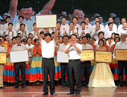 会后,主题为“红歌飞扬”的文艺演出在离退休职工代表队《把一切献给党》的合唱中拉开帷幕,平均年龄72岁的他们用饱含深情的歌声唱出了几十载不变的坚定理想与信念,感动了在场的观众。凯盛重工代表队的一曲《祖国颂》在交响乐队的伴奏下气势磅礴、荡气回肠,给观众带来极大震撼,被评为本次演出的特等奖。此外,蚌埠、上海、南京、深圳等地的12支代表队相继登场表演了精心编排的经典红歌曲目。从再现长征场景的《四渡赤水出奇兵》到粉碎四人帮后举国欢庆的《祝酒歌》;从歌颂改革开放巨大变化的《春天的故事》到展望党领导下人民幸福生活的《在灿烂的阳光下》等等,全体演员以饱满的热情和极富感染力的艺术表现形式唱出了对红色历史的缅怀、对革命先辈的敬仰、对改革开放成果的赞美,唱出了对党的生日的由衷祝福和对祖国明天的美好祝愿;也唱出了凯盛人矢志不渝、开拓创新、团结拼搏、创先争优的壮志豪情和早日实现“百亿集团”的坚定信心,赢得了观众阵阵热烈掌声。