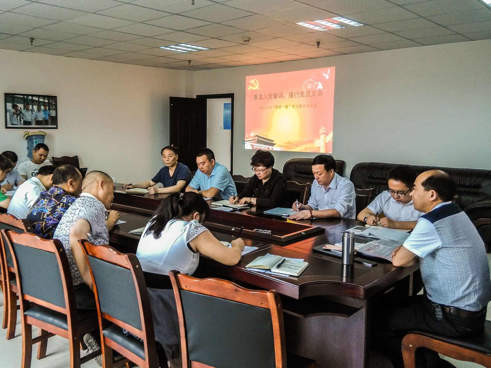 会议在庄严的国歌声中开始。公司党支部书记、总经理贺强同志带领全体党员重温了入党誓词。党支部组织委员何磊同志带领大家认真学习了中央关于开展“两学一做”学习教育活动的要求。