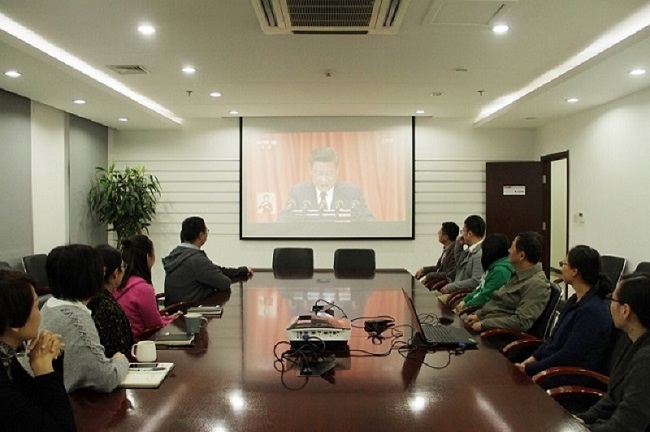 来源:中国建筑材料科学研究总院 发布时间:2017-10-20 10月18日上午9时,中国共产党第十九次全国代表大会在人民大会堂开幕。习近平总书记代表十八届中央委员会向大会作报告。总院党委对收听收看十九大开幕会高度重视,周密安排,认真落实,集中组织收看了大会开幕直播。总院党委书记王益民,党委副书记、纪委书记徐晖,副院长颜碧兰与100多名党员共同观看开幕盛况,第一时间学习会议精神,并要求各党总支组织学习,开展讨论活动和撰写心得体会。