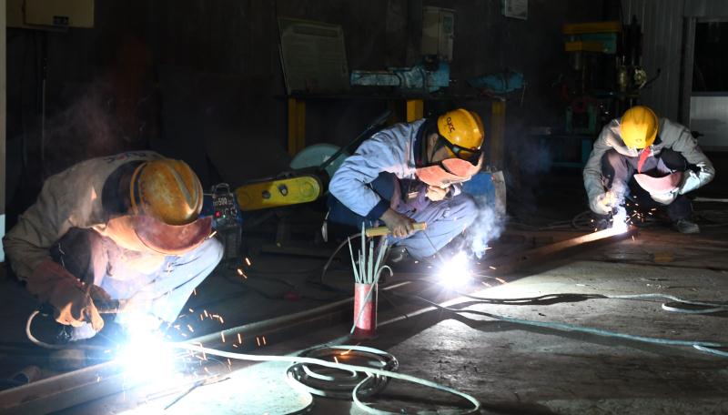 焊工技能比武场地设在在机修车间,比赛现场,参赛选手头戴防护罩,手持电焊枪,按照规程认真操作,熟练细心地在材料焊接处不停点焊,弧光四溢,焊花飞舞,原来两块毫无关联的两个钢管在选手们的努力下,很快被焊接成一个个精美的成品工件。